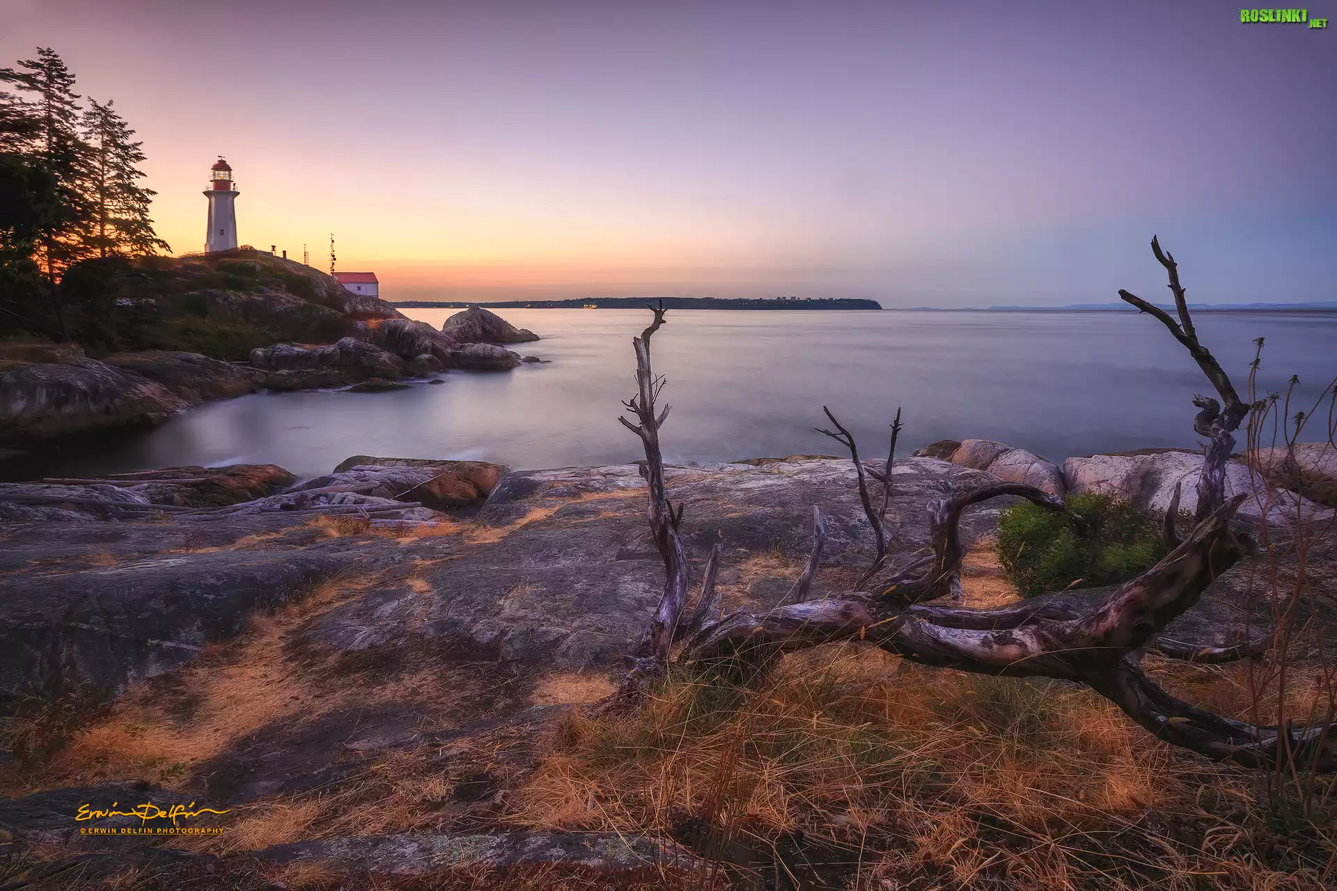 Rośliny: Skały, Konar, Latarnia morska Point Atkinson, Cieśnina Strait of Georgia, Vancouver, Kanada