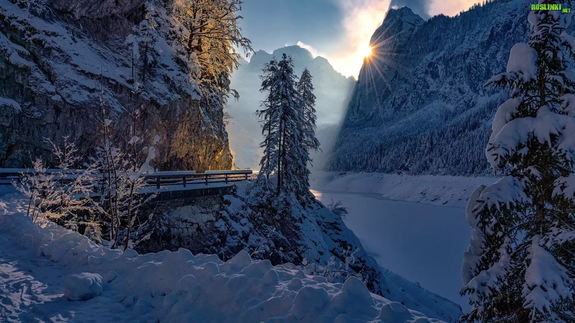Rośliny: Austria, Zima, Góry, Ośnieżone, Drzewa, Most, Jezioro, Gosausee, Śnieg, Słońce