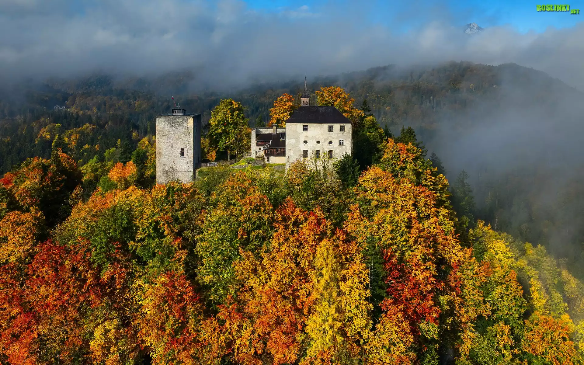 Rośliny: Góry, Zamek Thierberg, Las, Drzewa, Jesień, Mgła, Austria