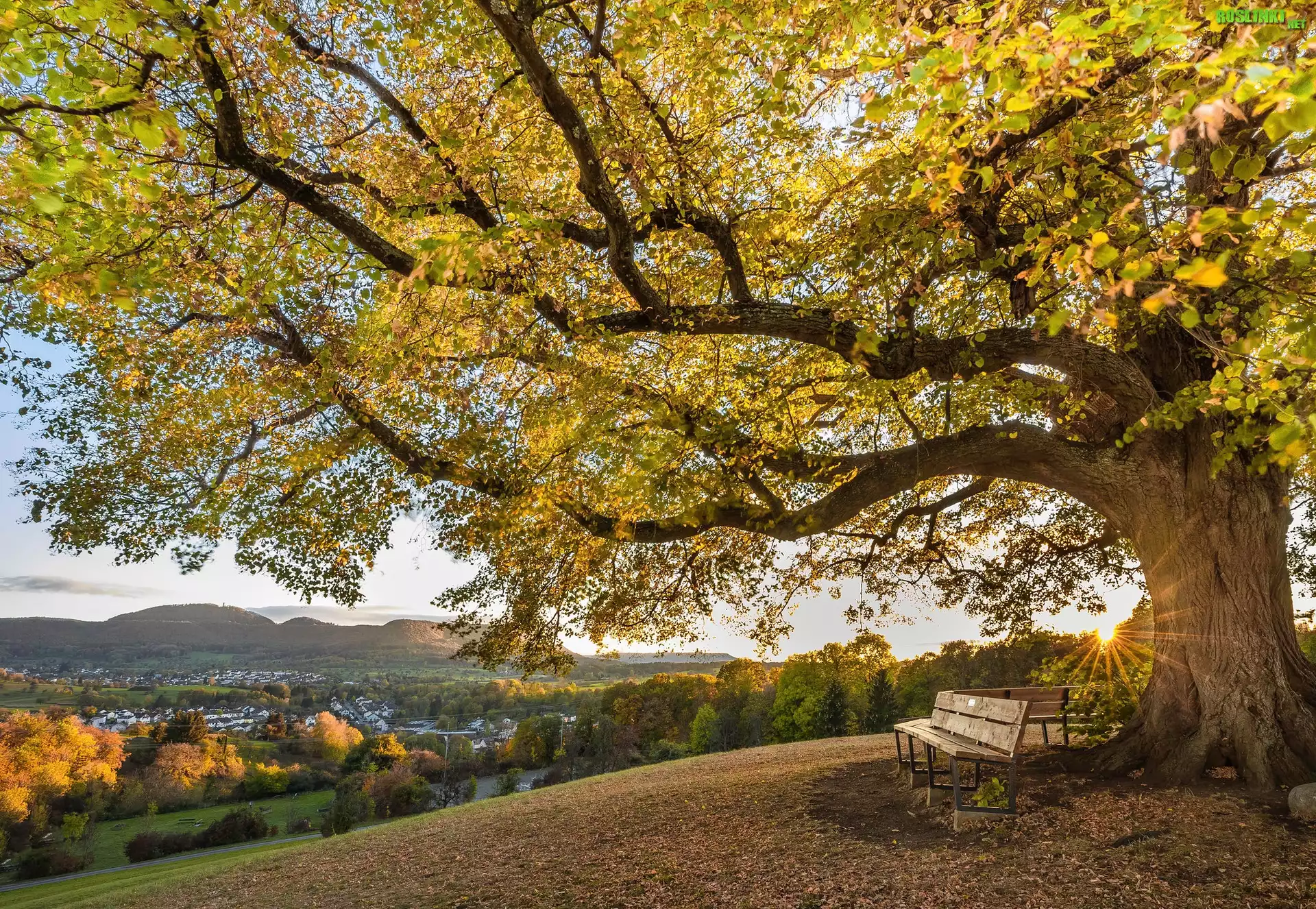 Rośliny: Drzewo, Ławka, Promienie słońca, Dolina, Widok, Wzgórza