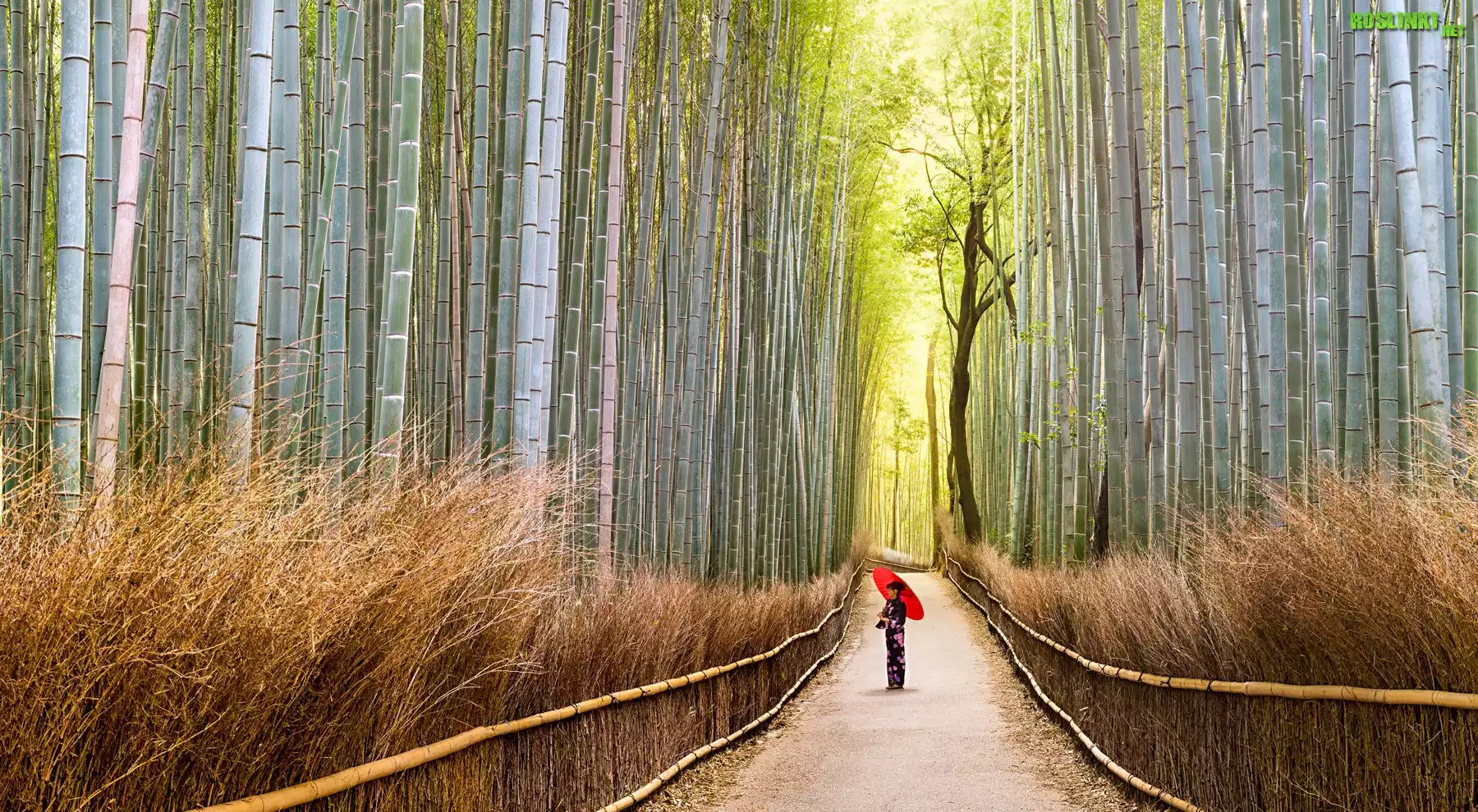 Rośliny: Kobieta, Azjatka, Bambusowy, Las, Droga, Czerwony, Parasol