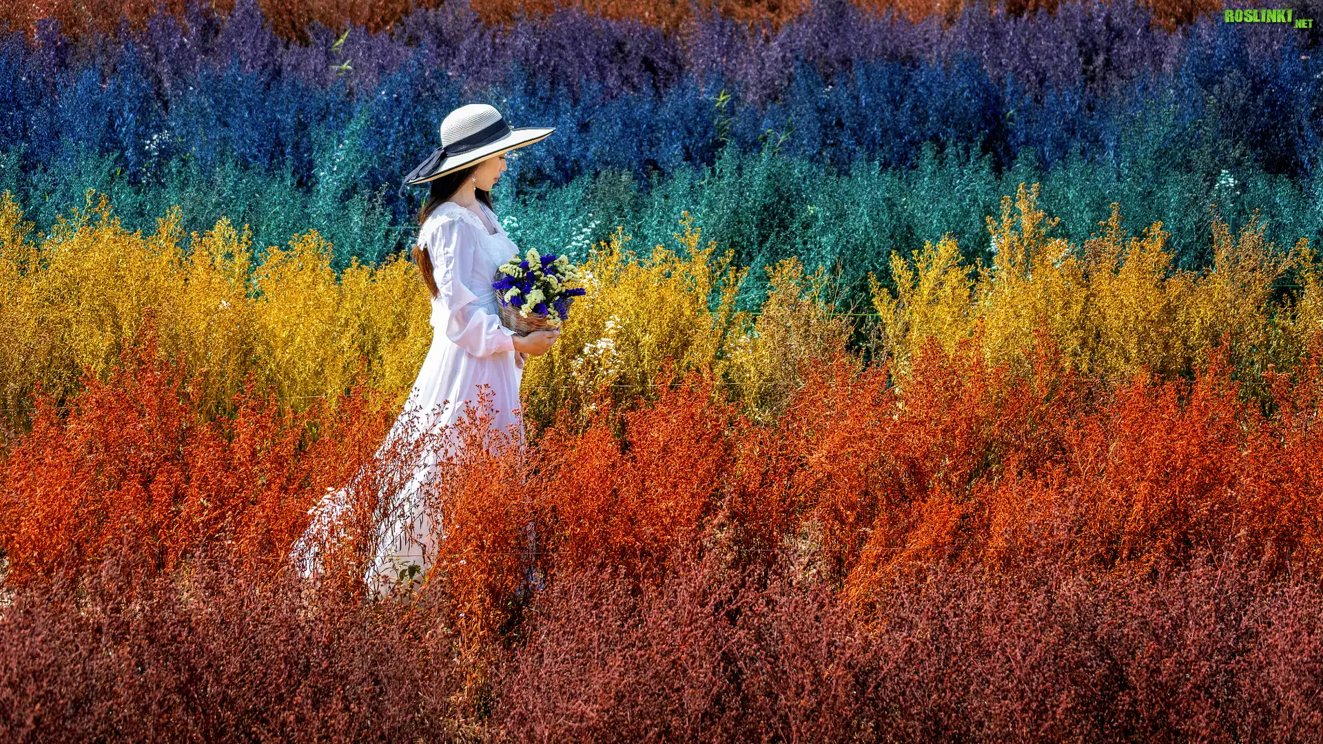 Rośliny: Kobieta, Azjatka, Pole, Biały, Kapelusz, Sukienka, Kolorowe, Rośliny