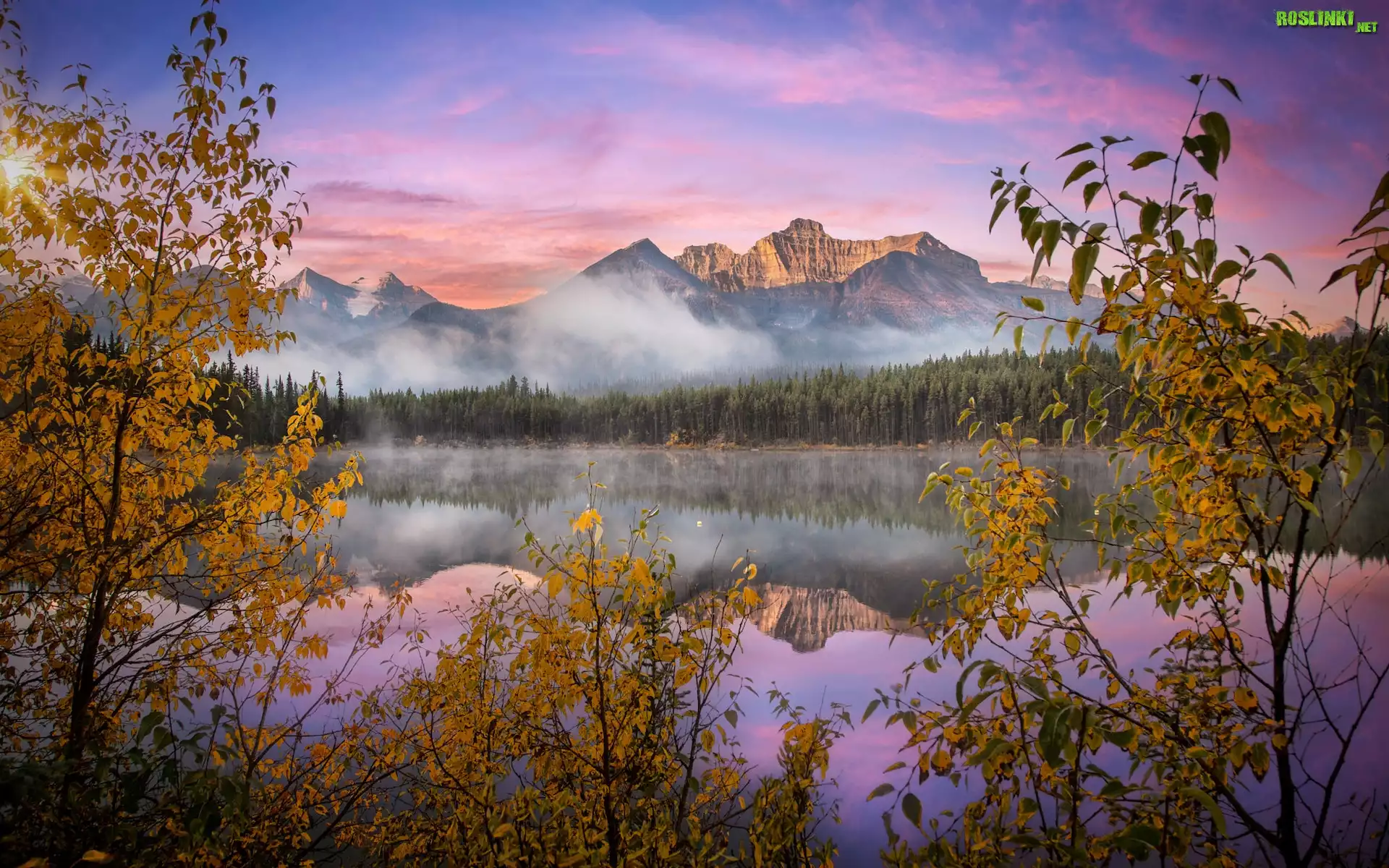 Rośliny: Kanada, Park Narodowy Banff, Góry, Canadian Rockies, Jezioro, Herbert Lake, Mgła, Jesień, Drzewa
