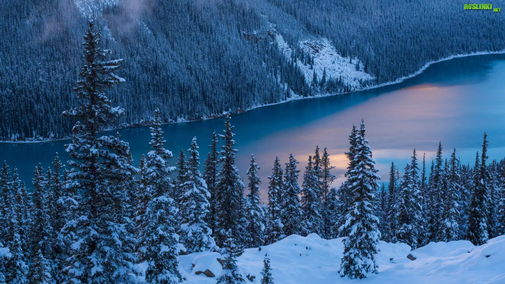 Rośliny: Zima, Śnieg, Drzewa, Park Narodowy Banff, Jezioro Peyto Lake, Prowincja Alberta, Kanada