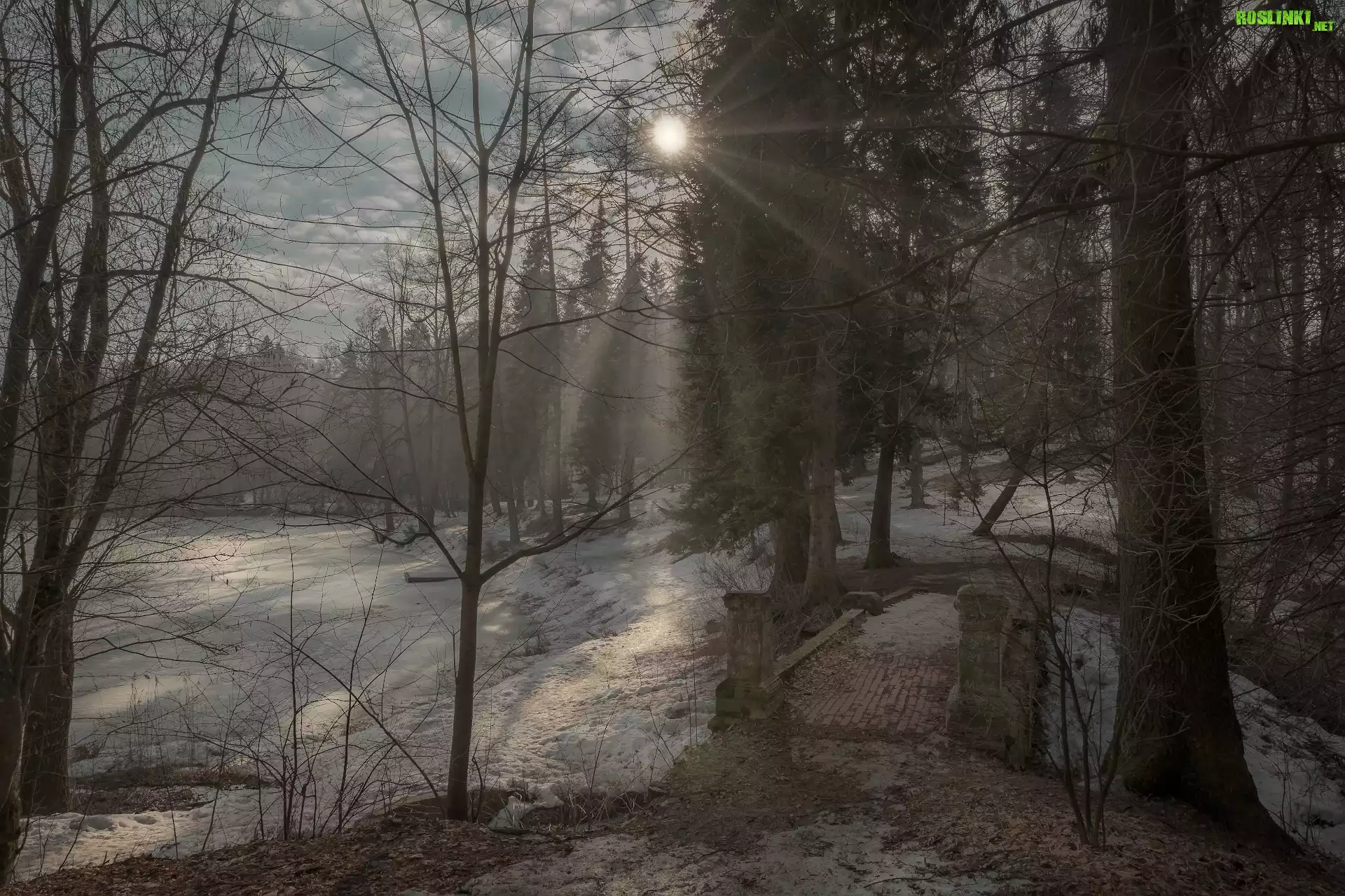 Rośliny: Zima, Staw Barski, Drzewa, Promienie słońca, Most, Serednikowo, Obwód moskiewski, Rosja