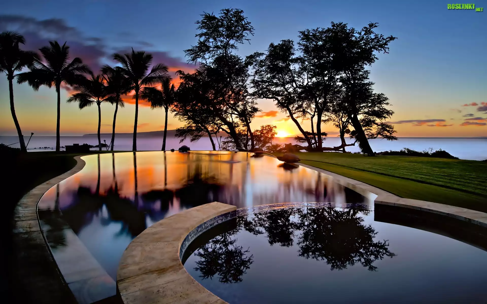 Rośliny: Basen, Zachód Słońca, Drzewa, Palmy