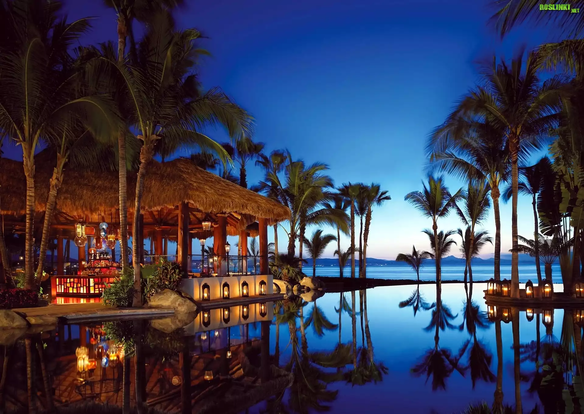 Rośliny: Basen, Ośrodek, Wakacje, Ocean, Wieczór, Meksyk