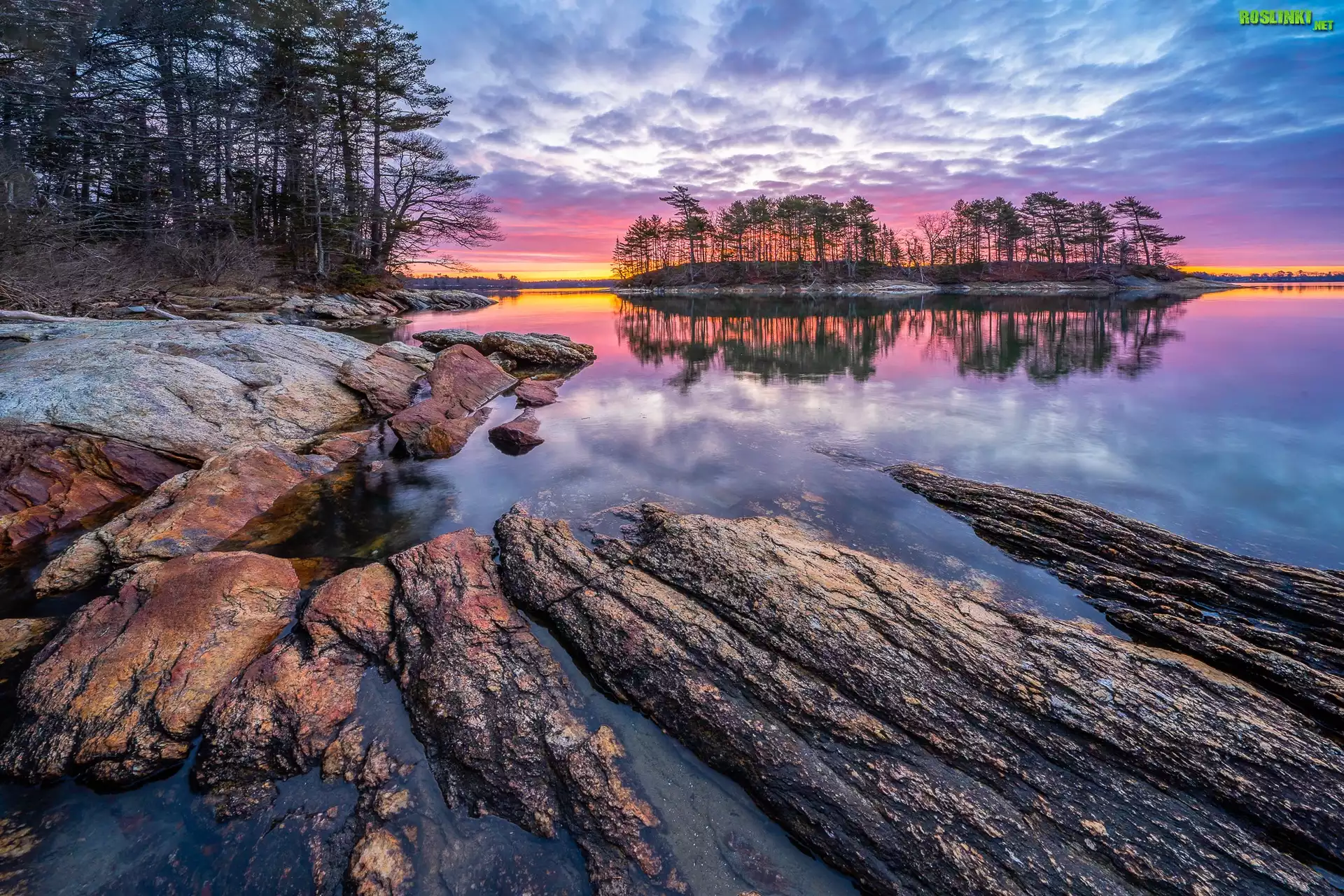 Wschód Słońca, Jezioro, Zatoka, Casco Bay, Skały, Drzewa, Chmury, Park Stanowy Wolfes Neck Woods, Stan Maine, Stany Zjednoczone |