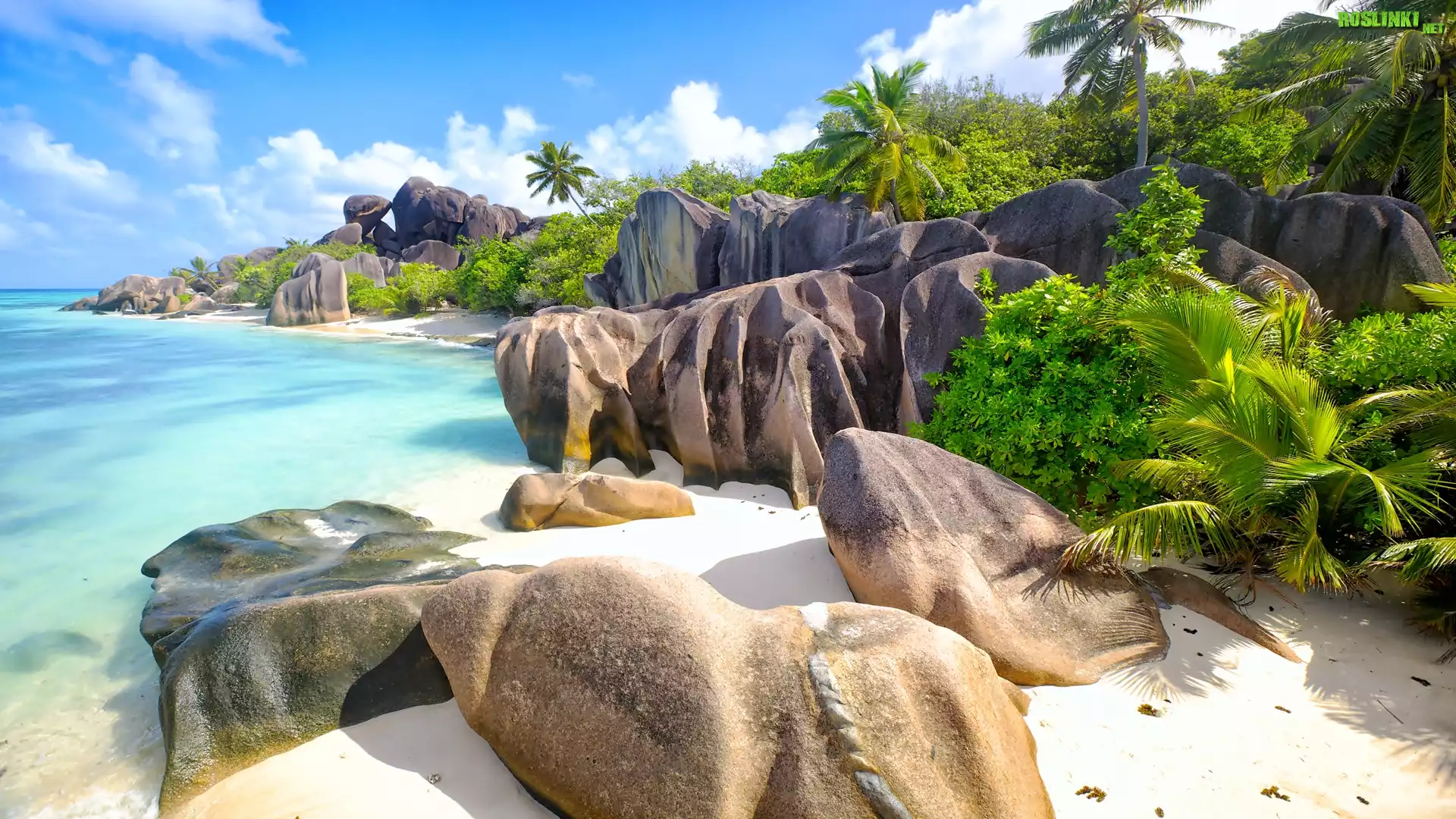 Rośliny: Seszele, Wyspa La Digue, Plaża Source dArgent Morze, Skały, Głazy, Palmy, Roślinność, Chmury