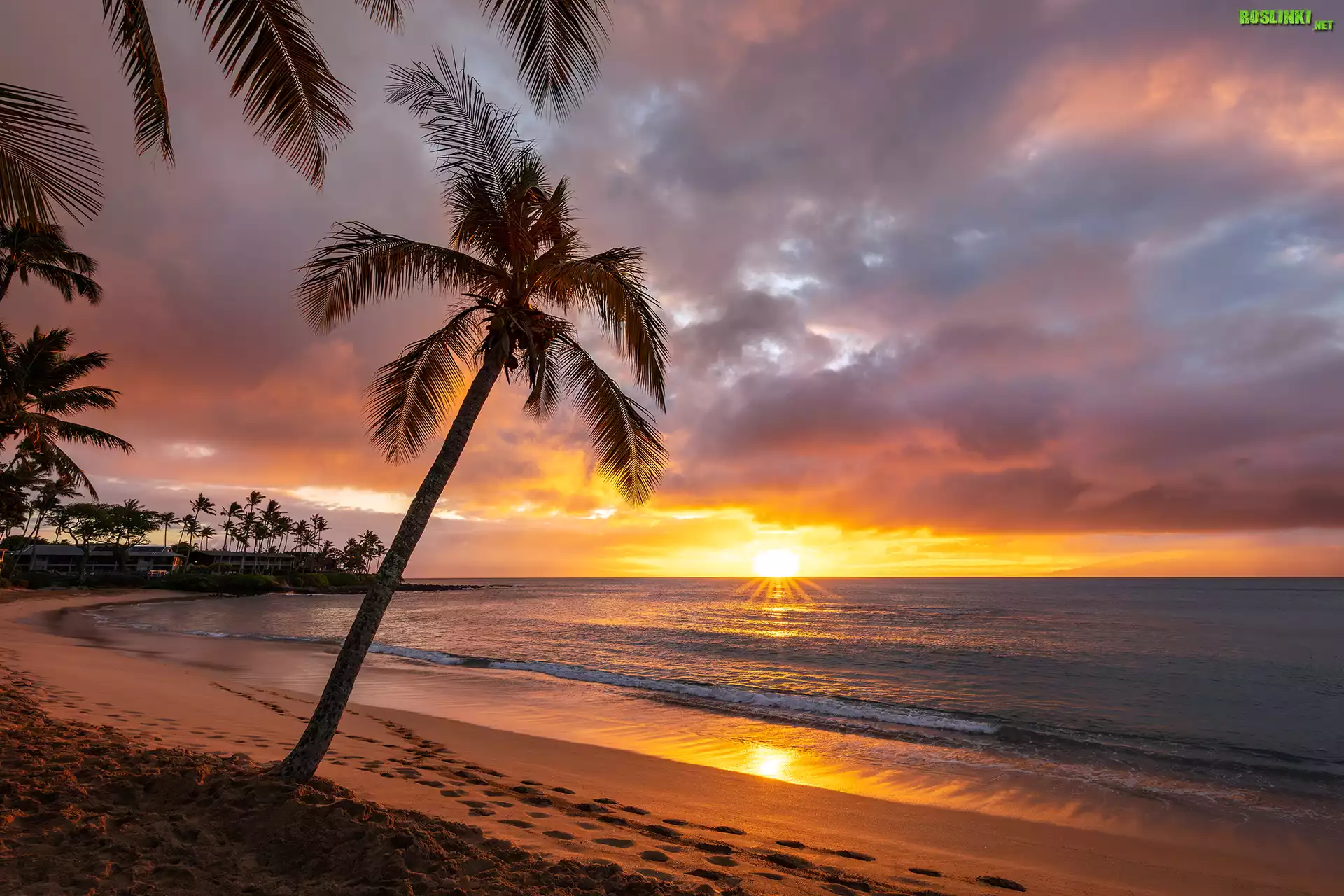 Rośliny: Zachód słońca, Chmury, Morze, Plaża, Napili Beach, Palmy, Wyspa, Maui, Hawaje
