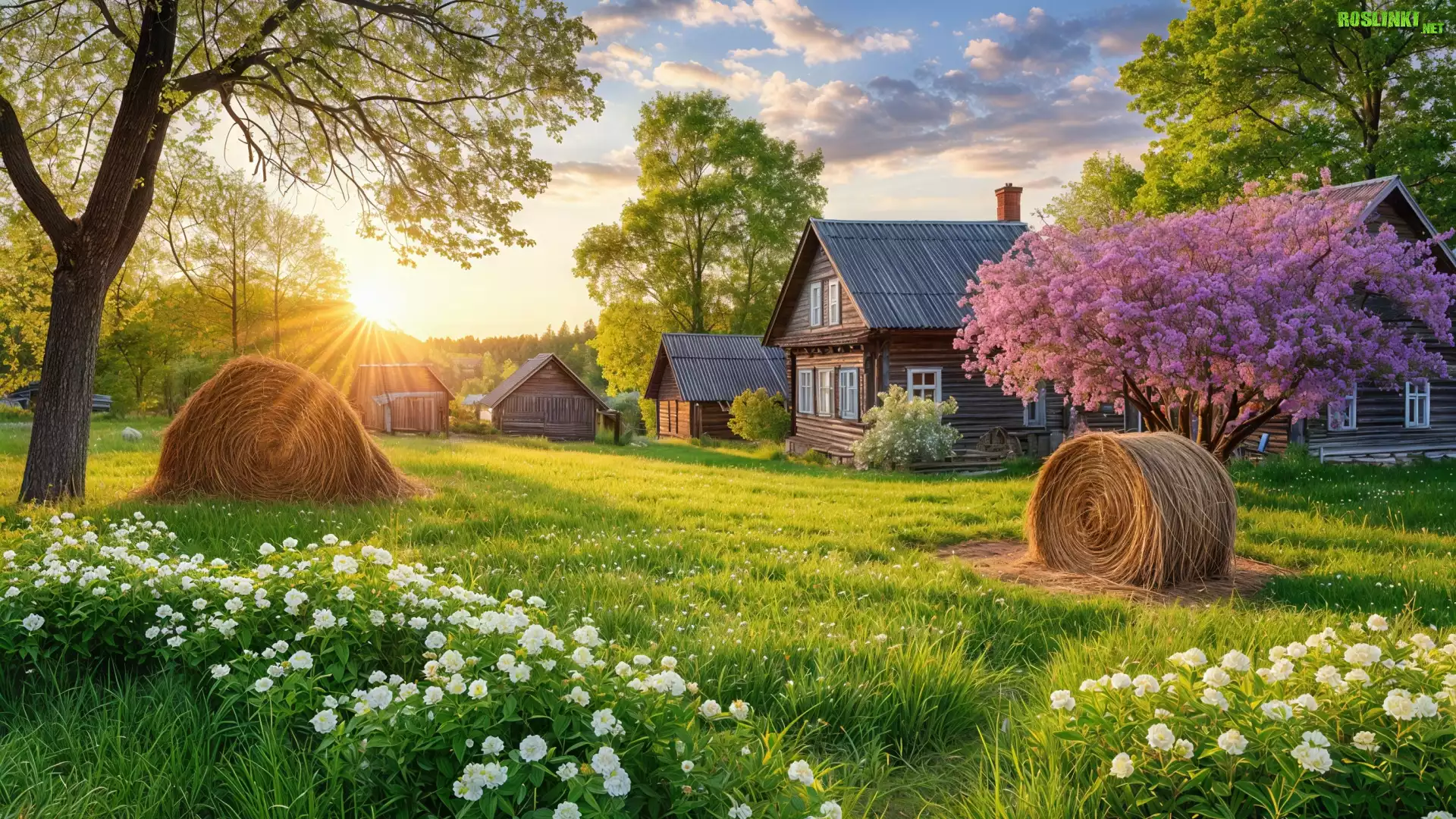 Rośliny: Wieś, Domy, Trawa, Bele, Słoma, Kwiaty, Drzewa