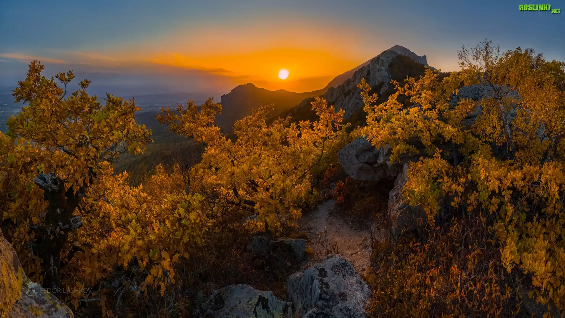 Rośliny: Góry Mount Beshtau, Skały, Drzewa, Krzewy, Zachód słońca, Kraj Stawropolski, Rosja