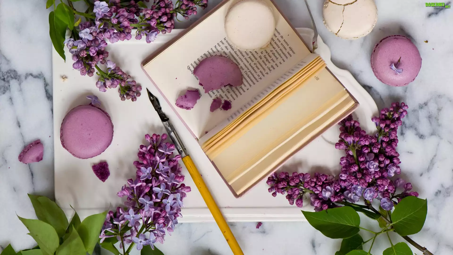Kompozycja, Bez, Książka, Pióro, Blat, Ciasteczka, Makaroniki
