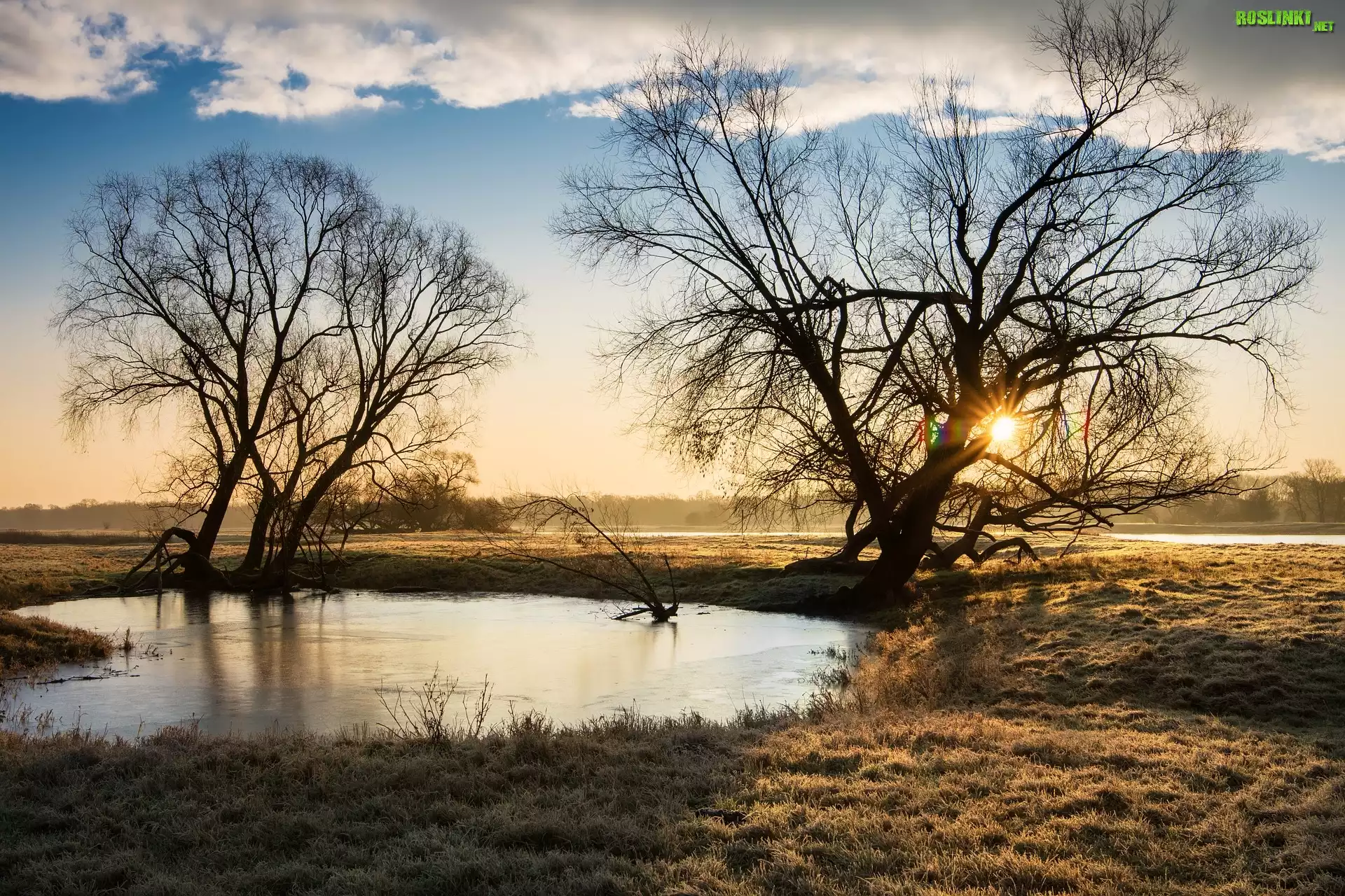 Rośliny: Bezlistne, Drzewa, Staw, Poranek