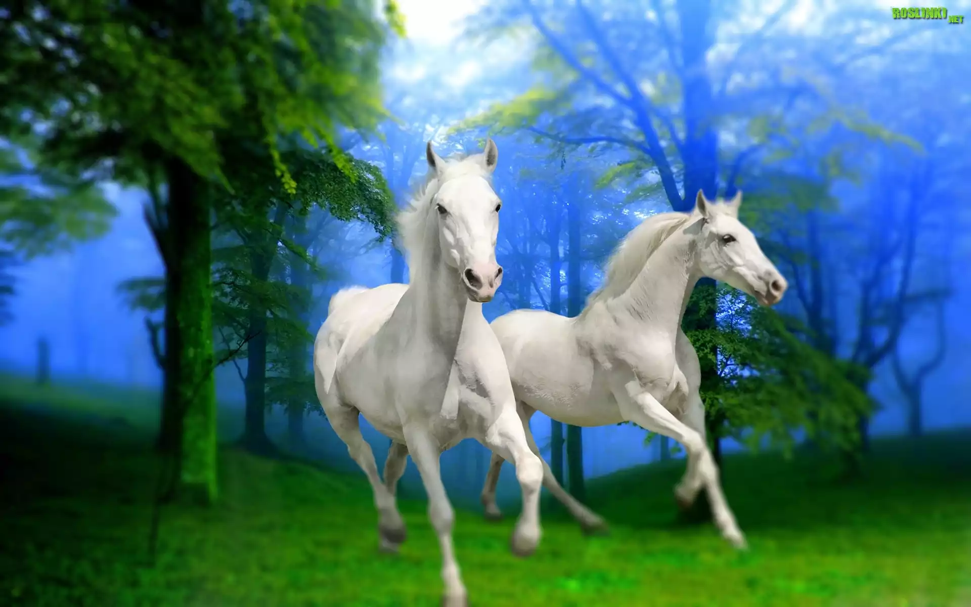 Rośliny: Białe, Konie, Las, Drzewa, Mgła