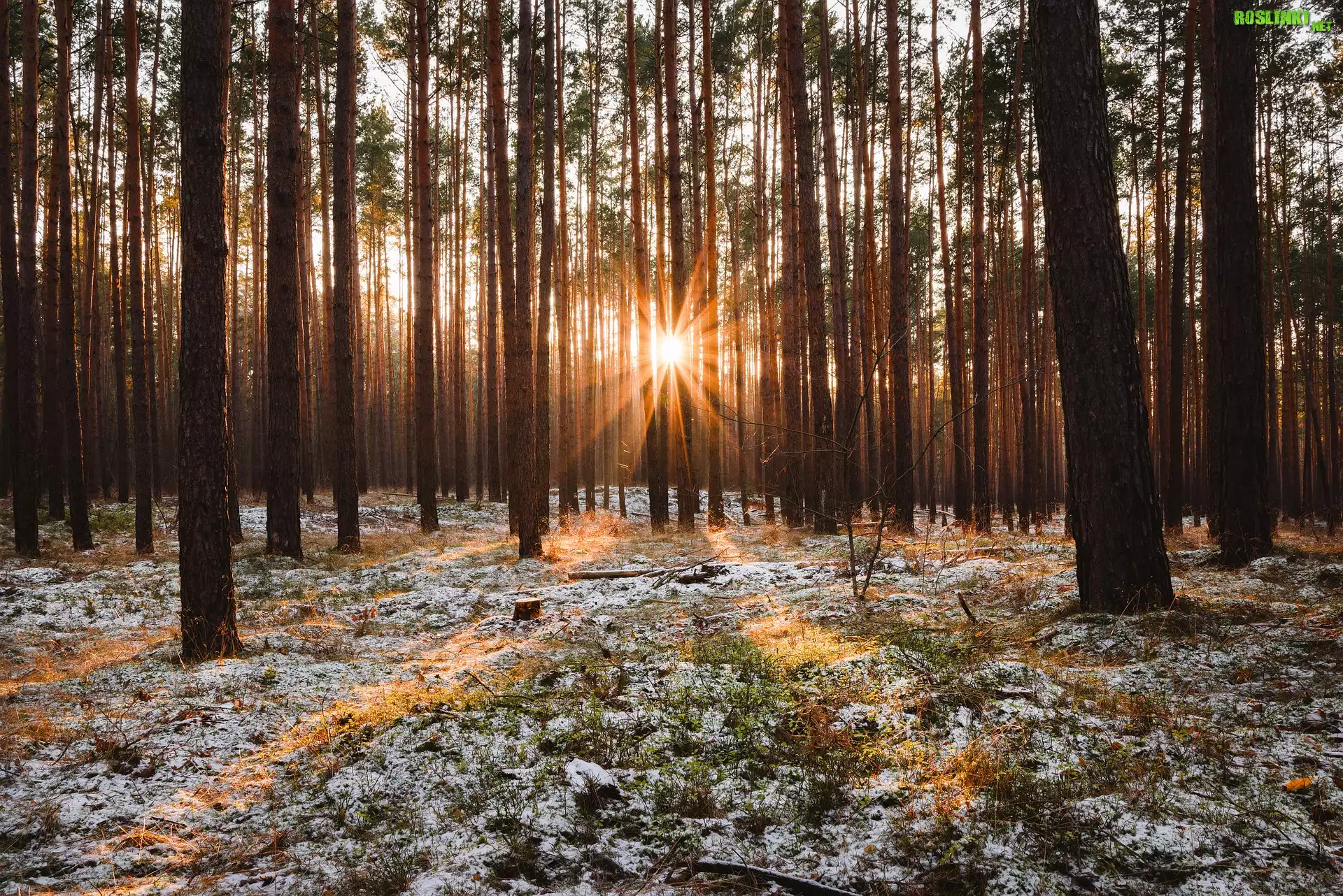 Rośliny: Las, Drzewa, Promienie słońca, Śnieg, Trawa, Słoneczny, Blask