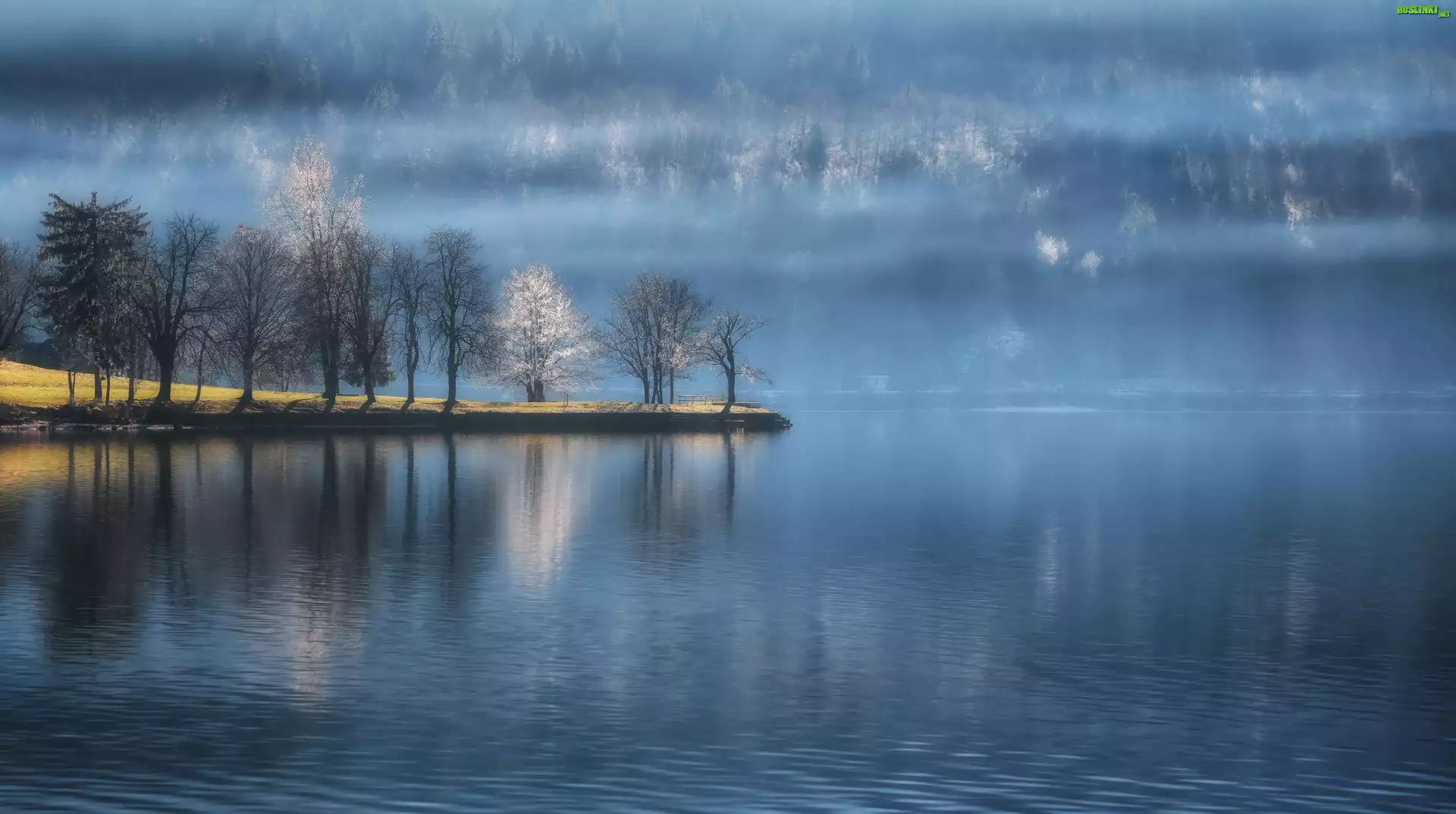 Rośliny: Jezioro Bohinj, Mgła, Drzewa, Triglavski Park Narodowy, Słowenia