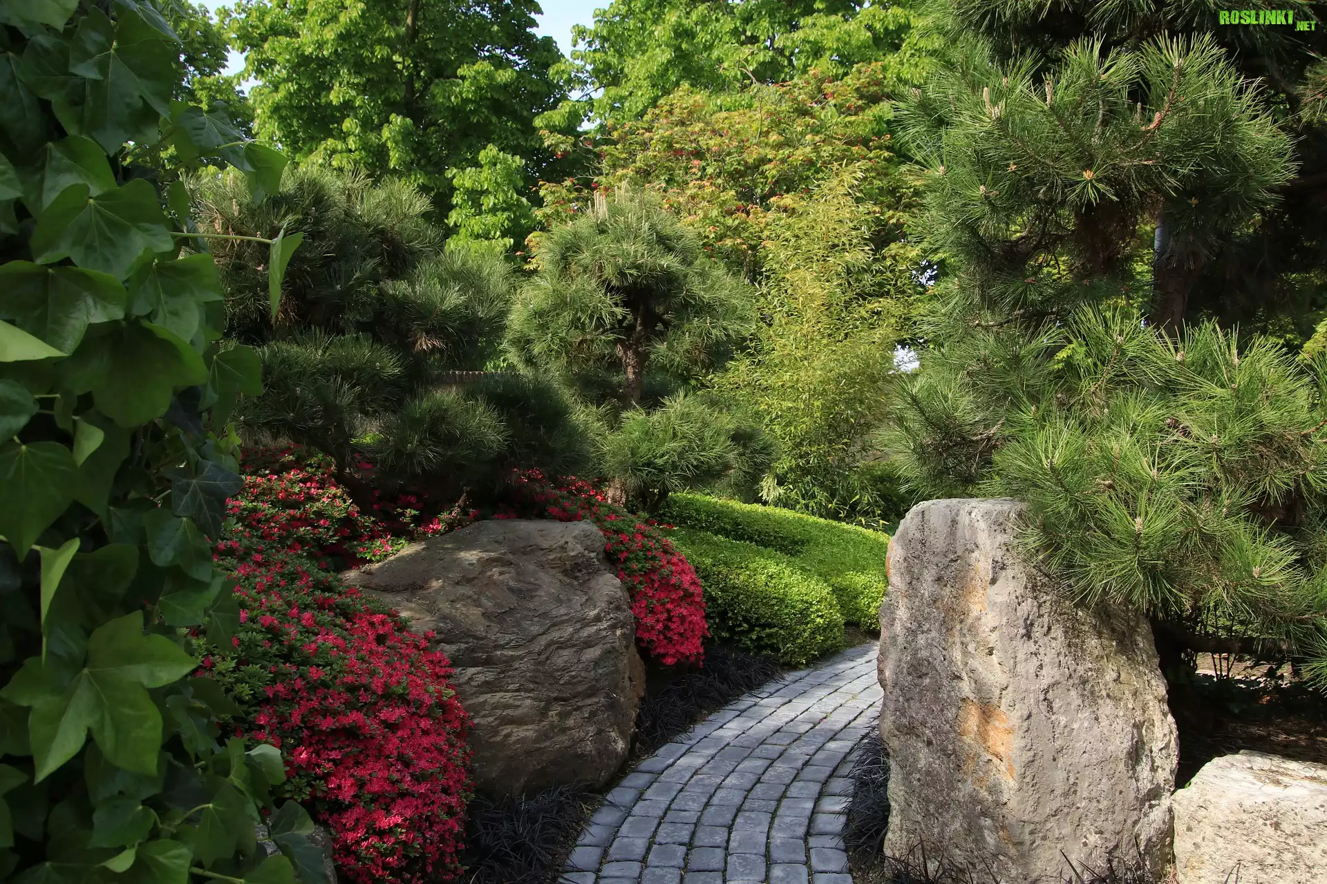 Rośliny: Park, Brukowana, Ścieżka, Kamienie, Azalie, Drzewa, Sosny