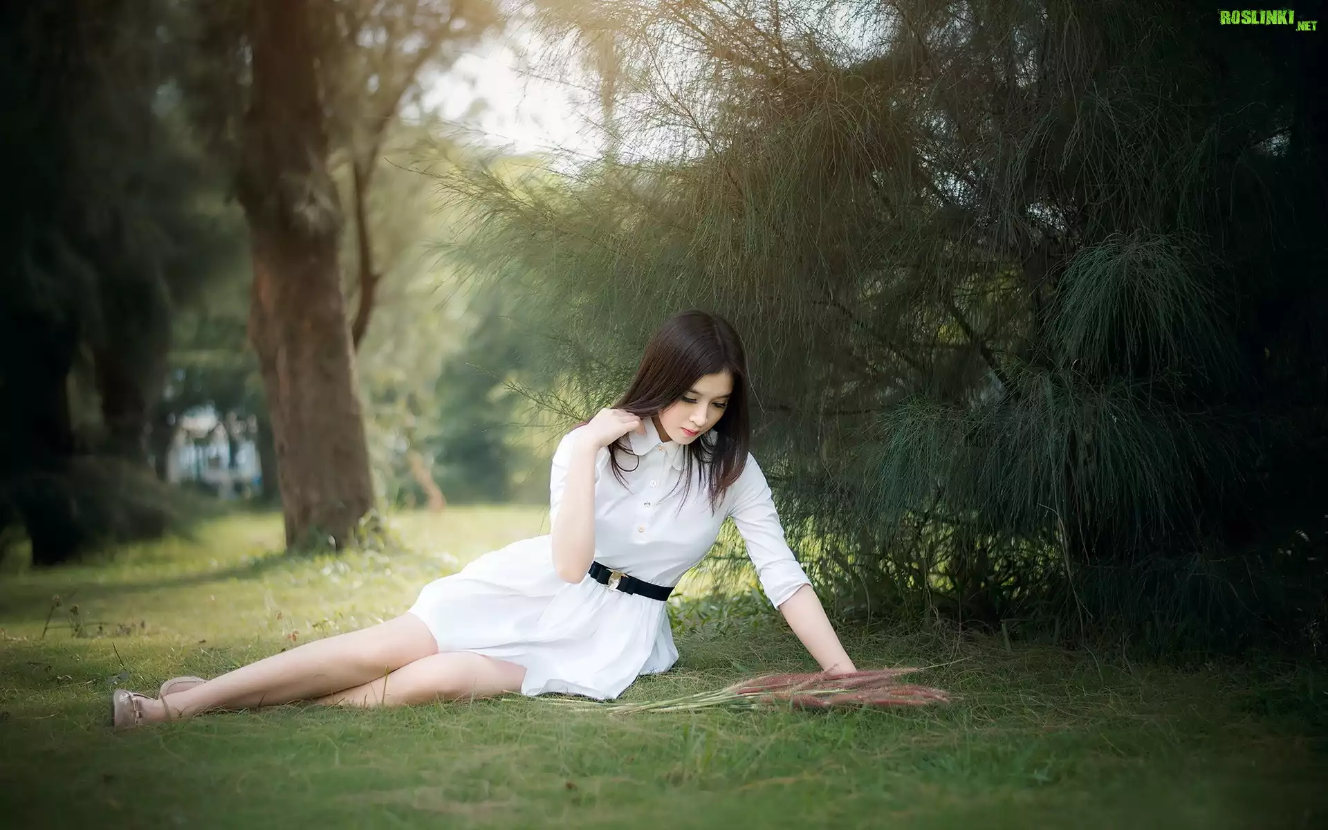Rośliny: Brunetka, Biała, Sukienka, Park, Drzewa, Trawa