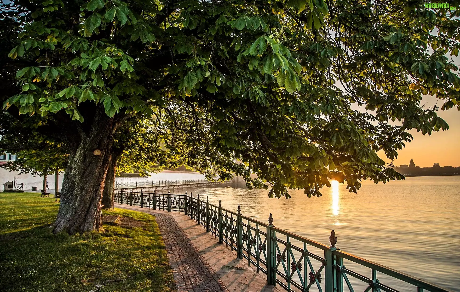 Rośliny: Rzeka, Brzeg, Drzewa, Kasztanowiec, Alejka, Wschód słońca