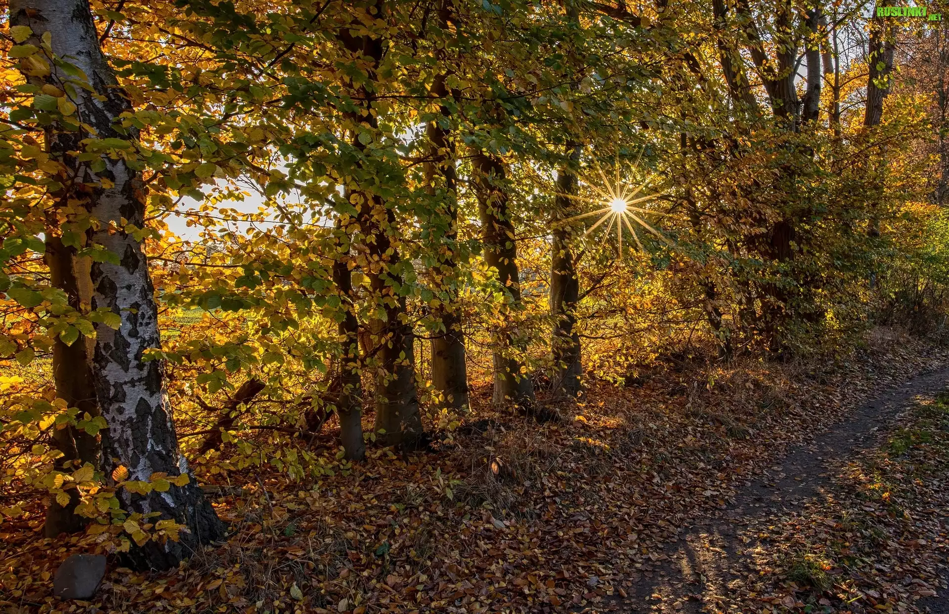 Rośliny: Drzewa, Brzozy, Liście, Promienie słońca, Ścieżka, Jesień