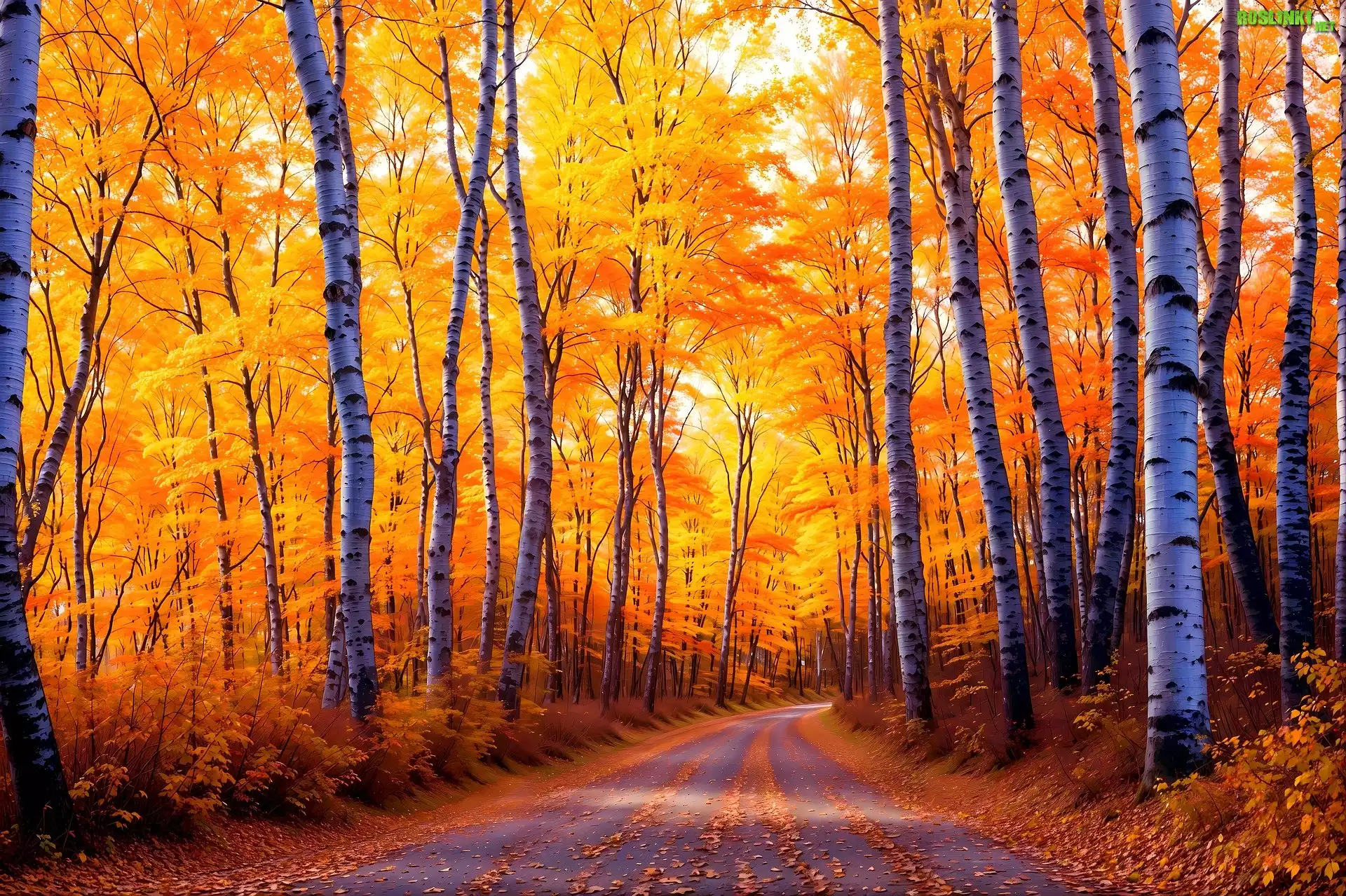 Rośliny: Jesień, Las, Droga, Brzozy, Drzewa, Grafika