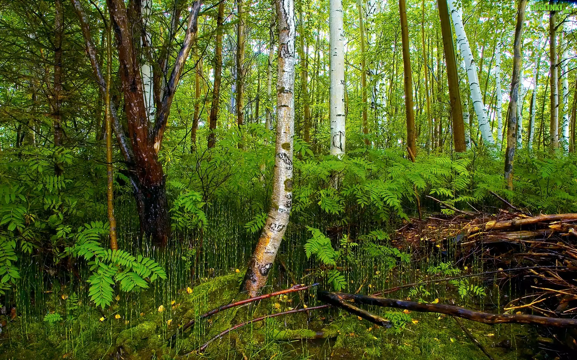 Brzozy, Paprocie, Zielony, Las