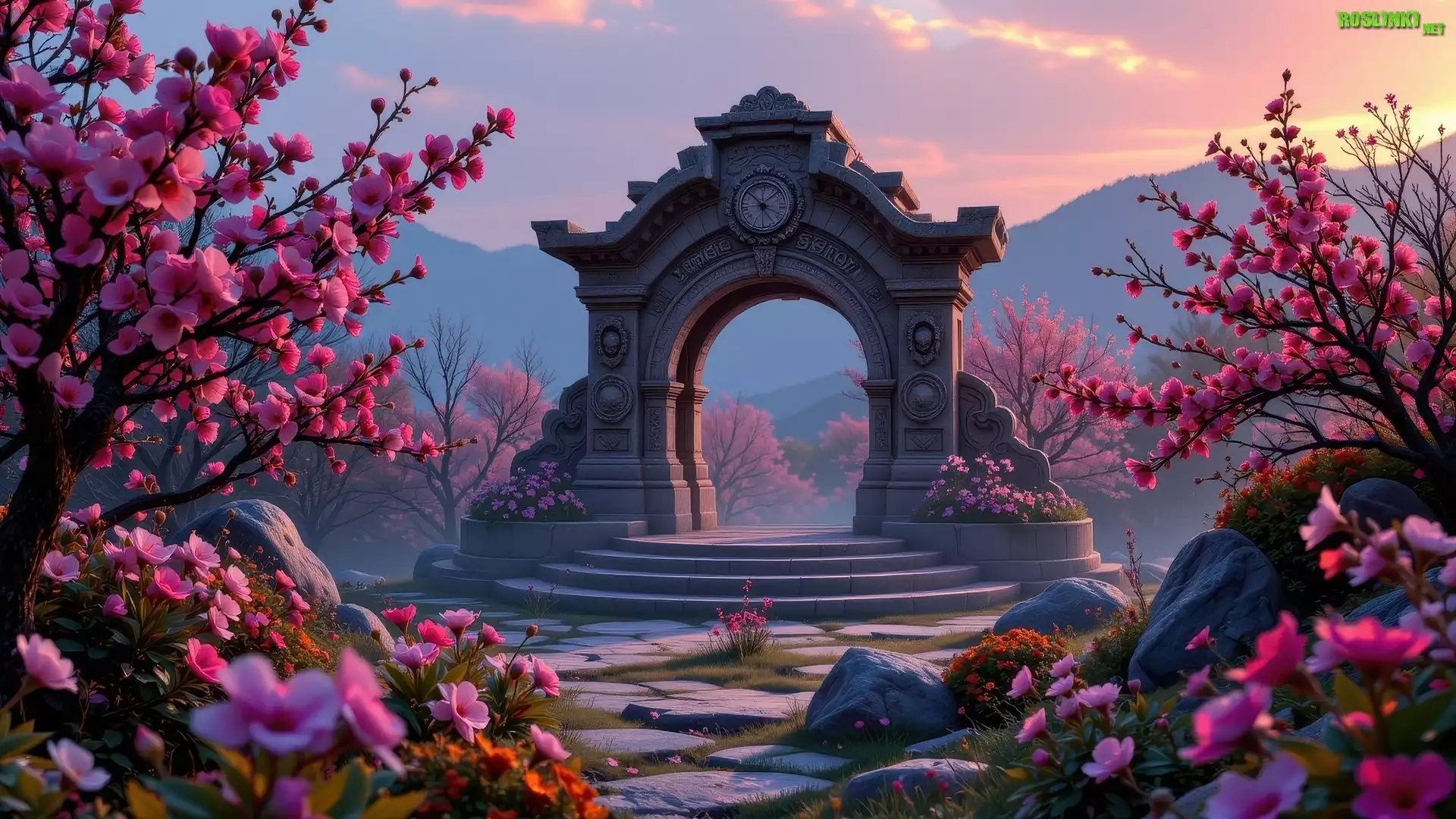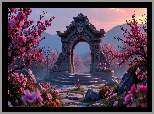 Rośliny: Budowla, Schody, Kwitnące, Drzewa, Różowe, Kwiaty, Góry, Kamienie, AI