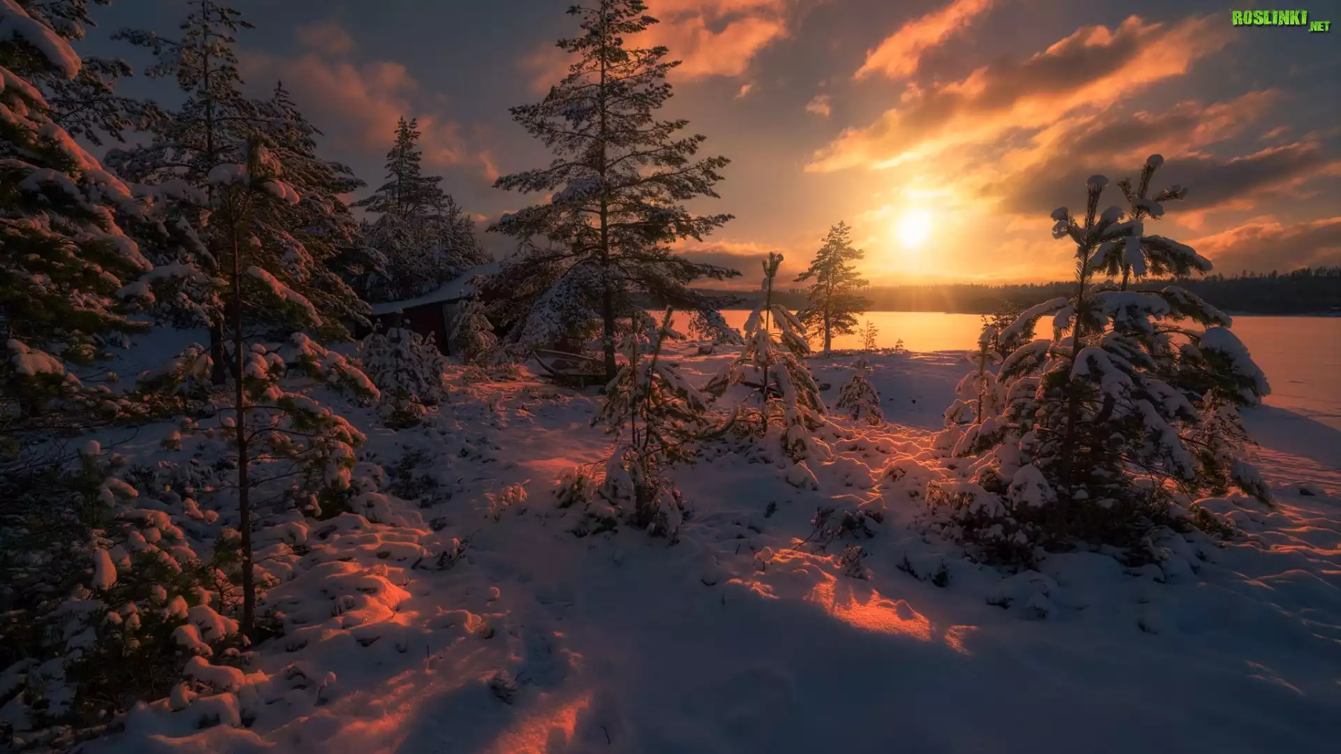 Rośliny: Norwegia, Ringerike, Zima, Zachód słońca, Jezioro, Drzewa, Łódka, Drewniany, Budynek