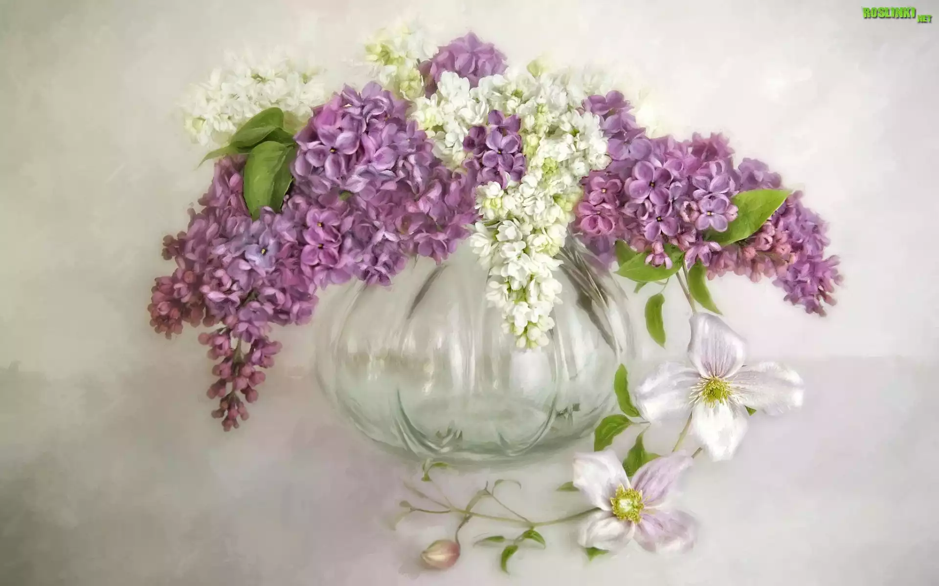 Rośliny: Wazonik, Bukiet, Kwiaty, Biały, Liliowy, Bez, Powojnik, Grafika