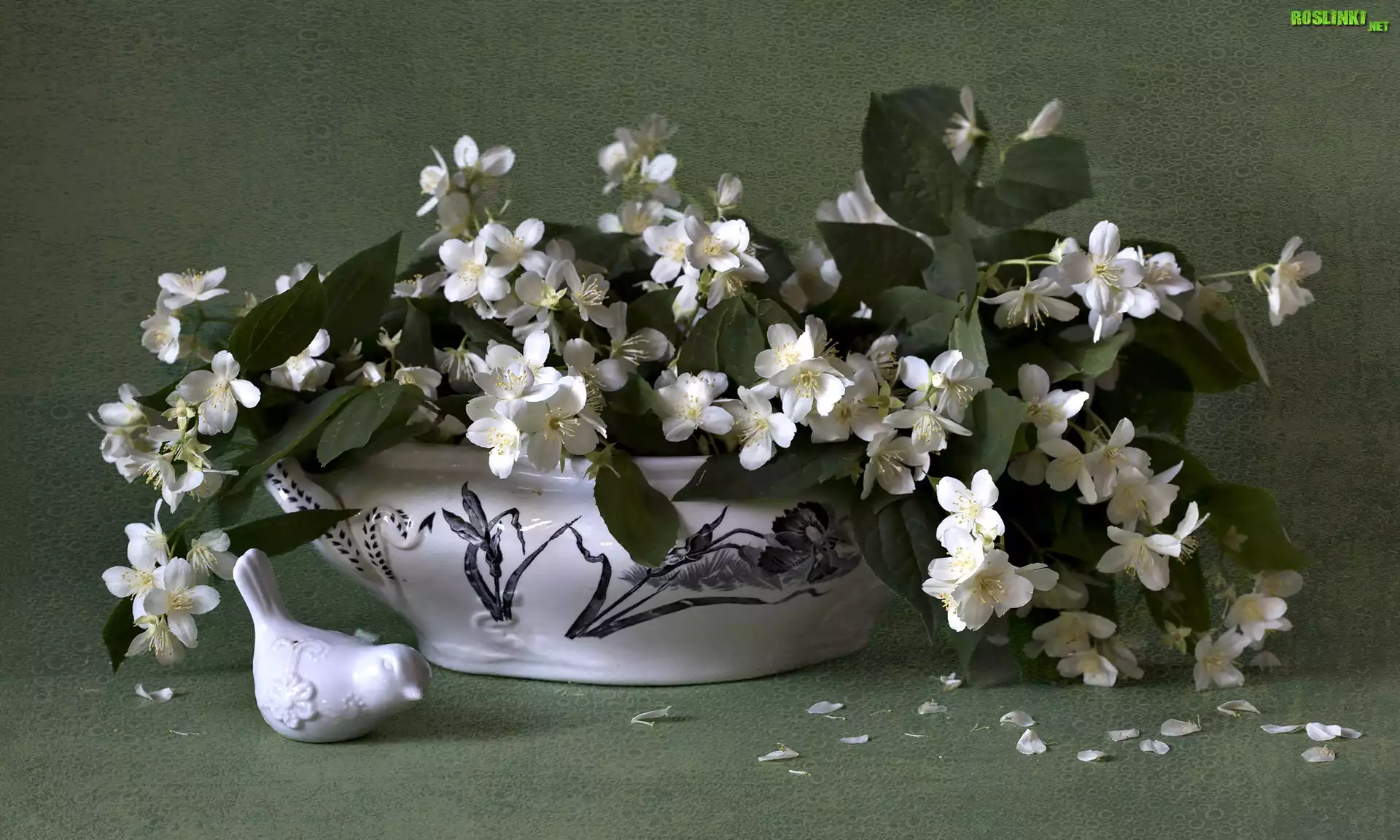 Rośliny: Jaśminowiec, Bukiet, Waza, Figurka, Ptaszek, Zielone, Tło