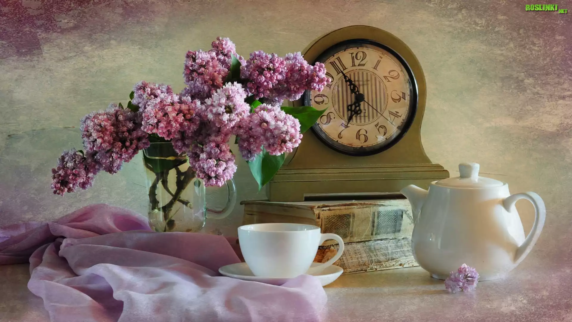 Rośliny: Kompozycja, Bukiet, Bez, Zegar, Książki, Filiżanka, Czajniczek