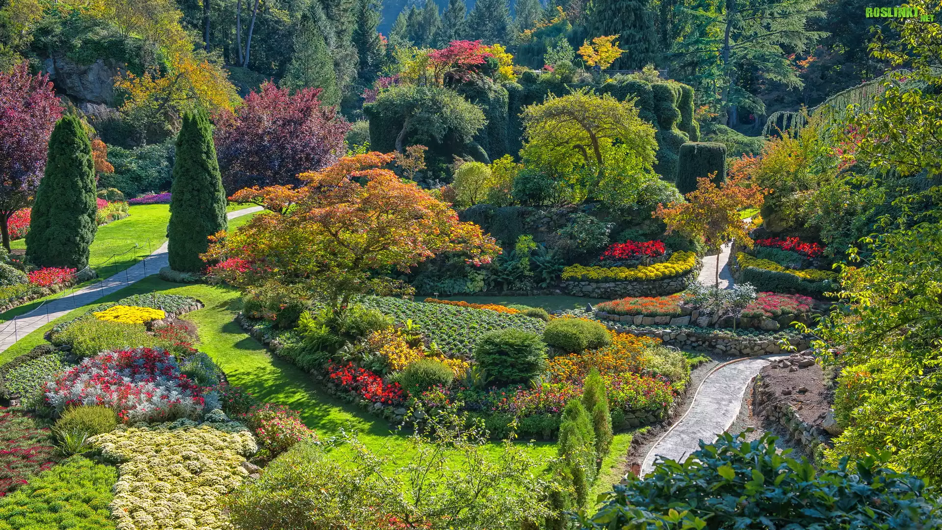 Rośliny: Ogród, Drzewa, Rabaty, Klomby, Alejki, Butchart Gardens, Brentwood Bay, Kolumbia Brytyjska, Kanada