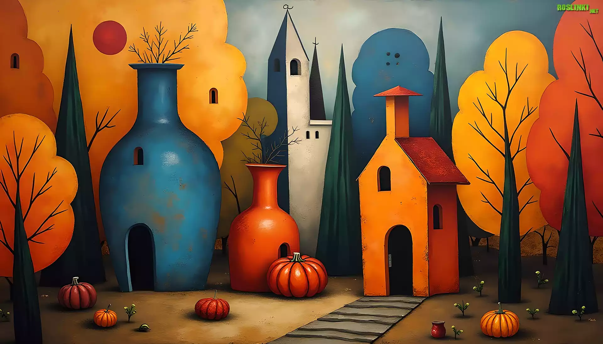Domy, Butelki, Drzewa, Dynie, Grafika