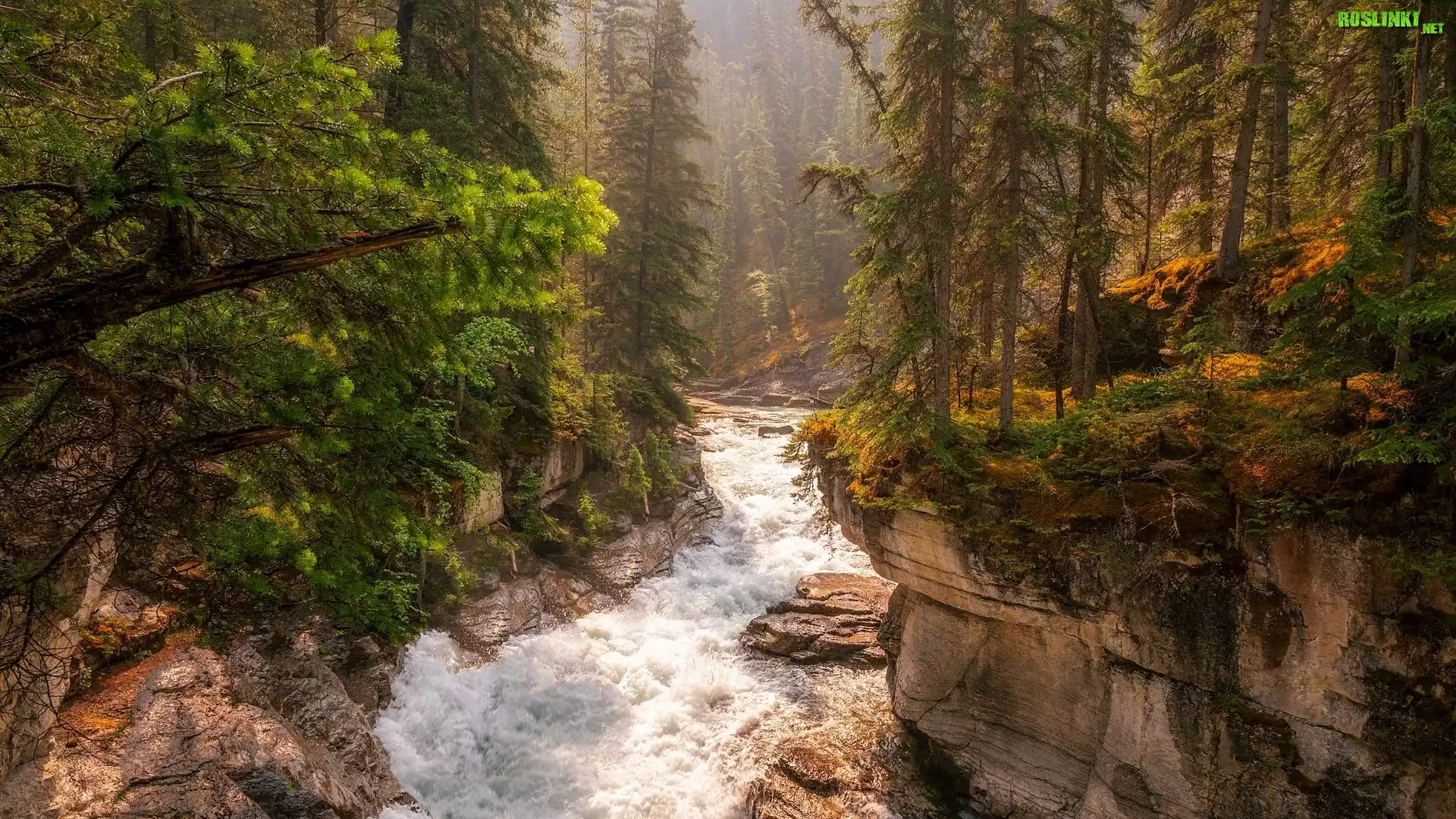 Rośliny: Skały, Rzeka, Maligne River, Drzewa, Maligne Canyon, Park Narodowy Jasper, Kanada