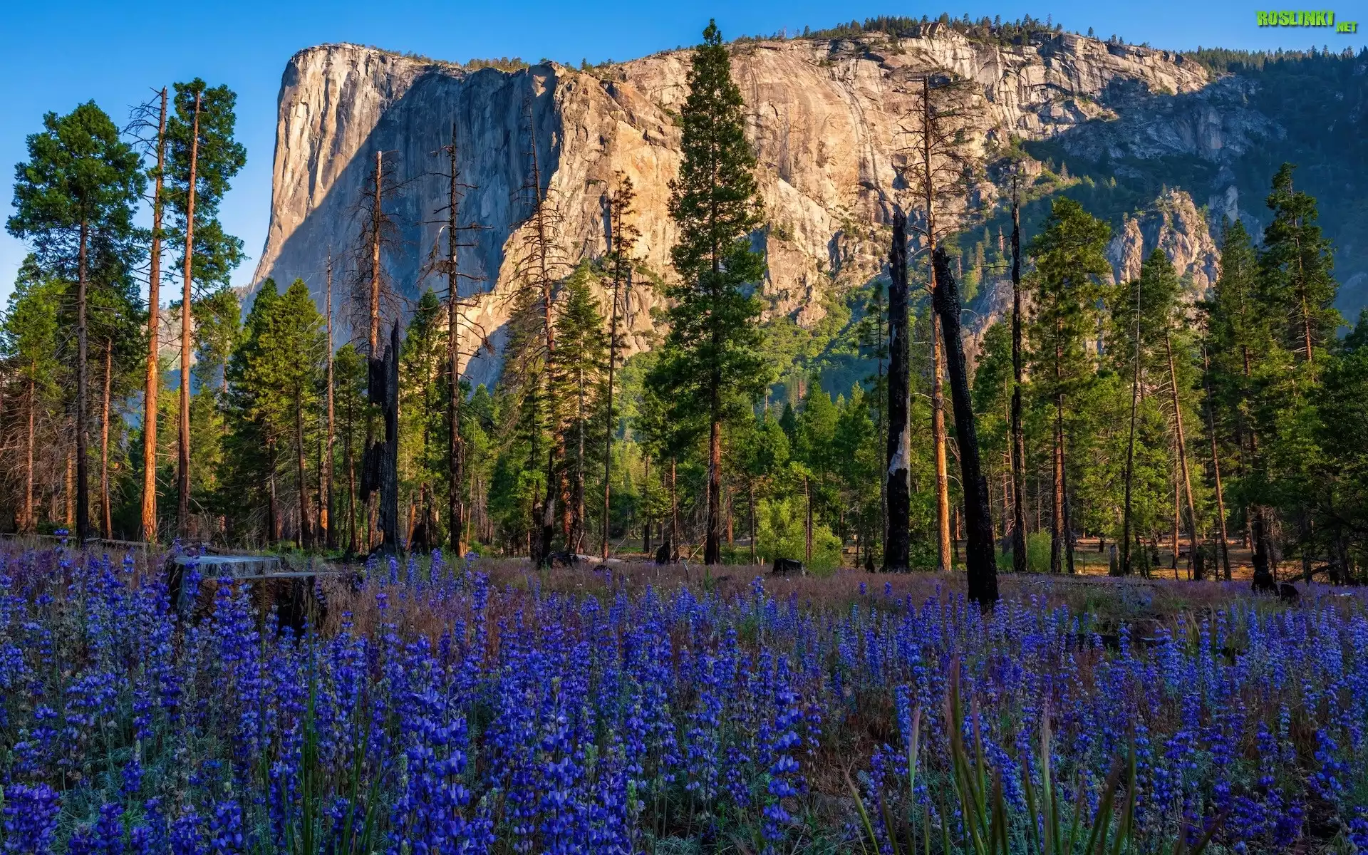 Rośliny: Stany Zjednoczone, Kalifornia, Park Narodowy Yosemite, Drzewa, Góra, El Capitan, Skała, Kwiaty