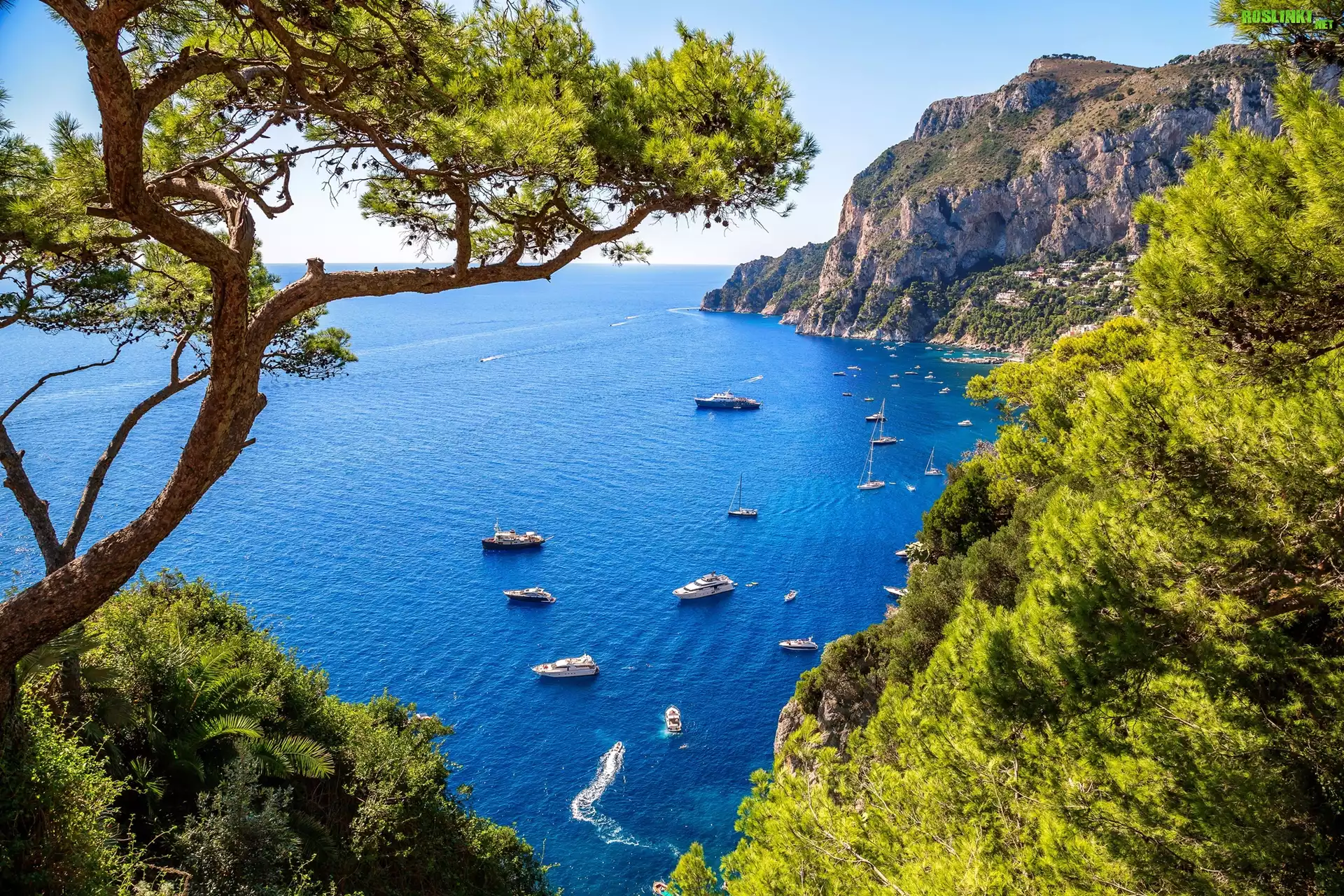 Rośliny: Włochy, Wyspa Capri, Zatoka Marina Piccola, Morze Tyrreńskie, Drzewo, Skały, Jachty