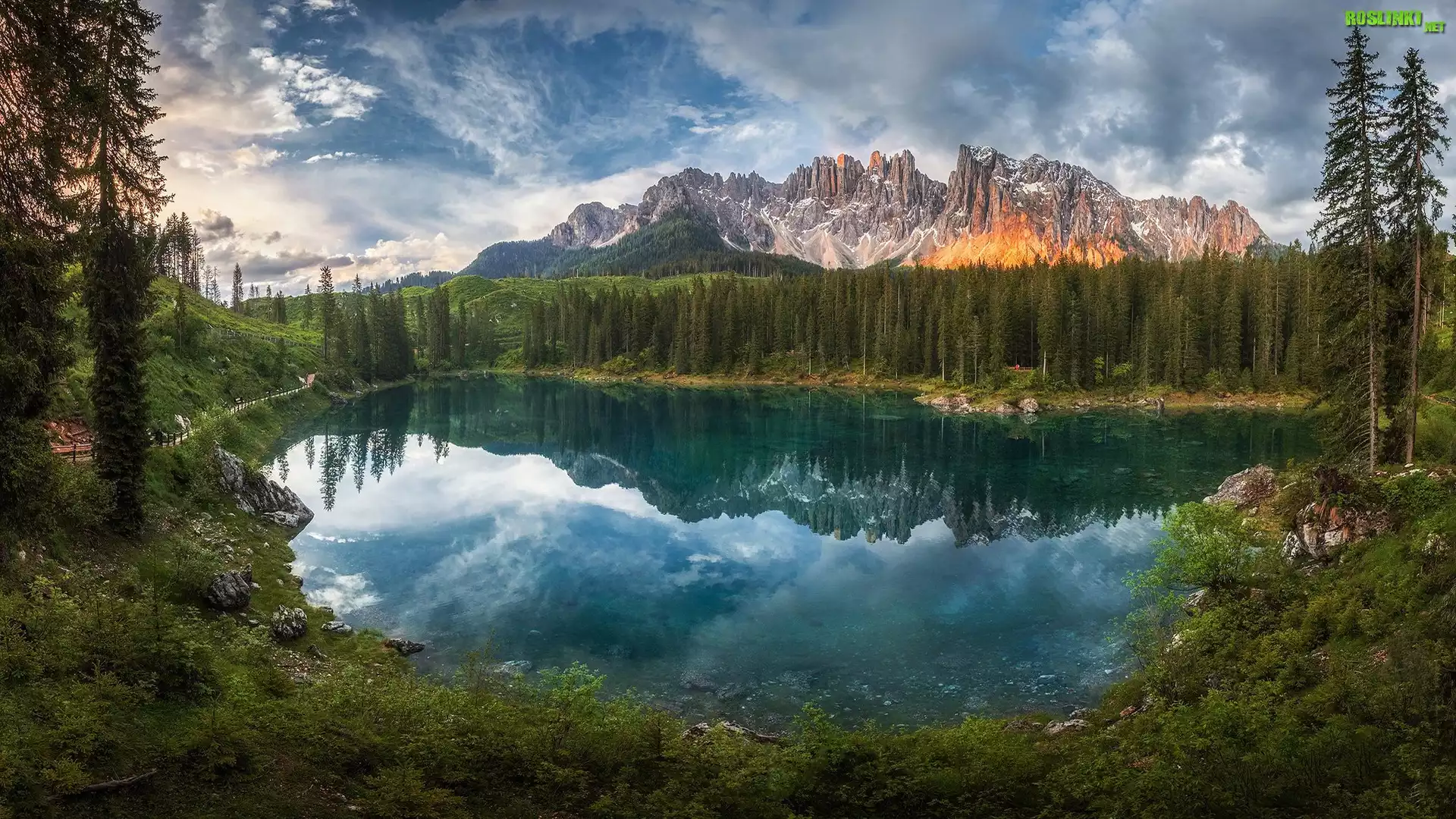 Las, Drzewa, Chmury, Góry, Jezioro, Lago di Carezza, Góry, Alpy, Dolomity, Odbicie, Brzeg, Kamienie, Włochy |