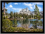 Jezioro, Cathedral Lake, Park Narodowy Yosemite, Góry, Szczyt, Cathedral Peak, Drzewa, Kalifornia, Stany Zjednoczone |