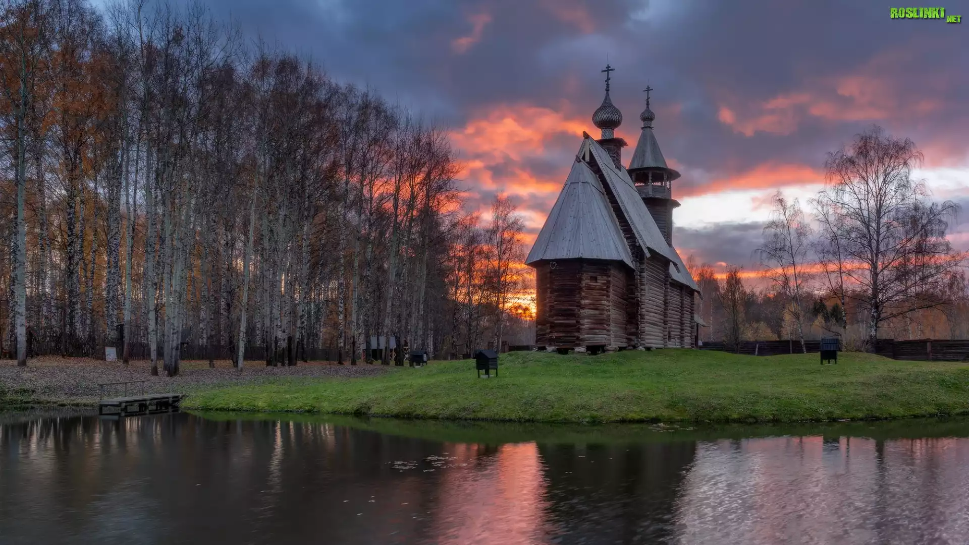 Drewniana, Cerkiew, Rzeka, Drzewa, Brzozy, Kostroma, Rosja