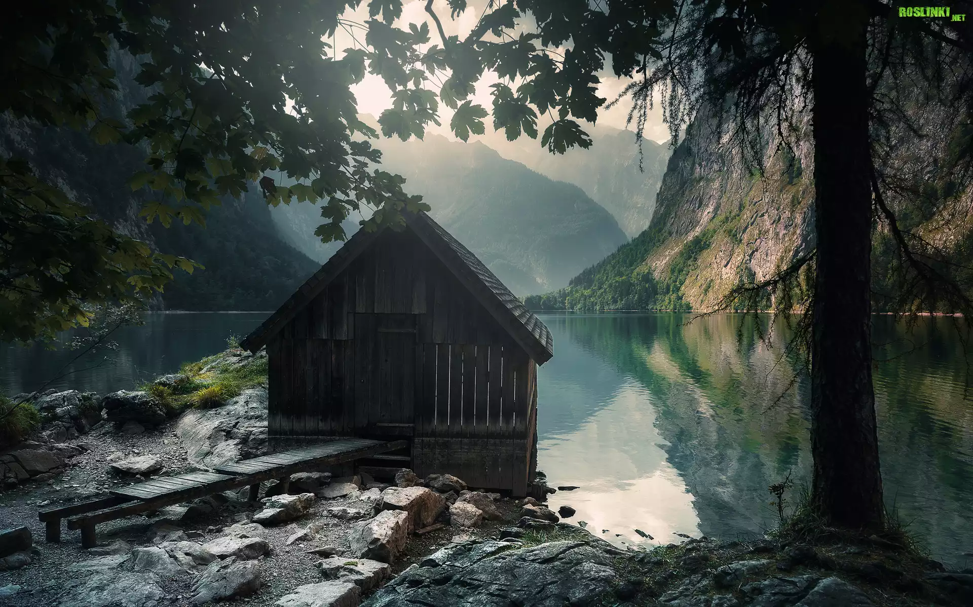 Rośliny: Góry, Drewniana, Chata, Jezioro Konigssee, Drzewa, Park Narodowy Berchtesgaden, Bawaria, Niemcy