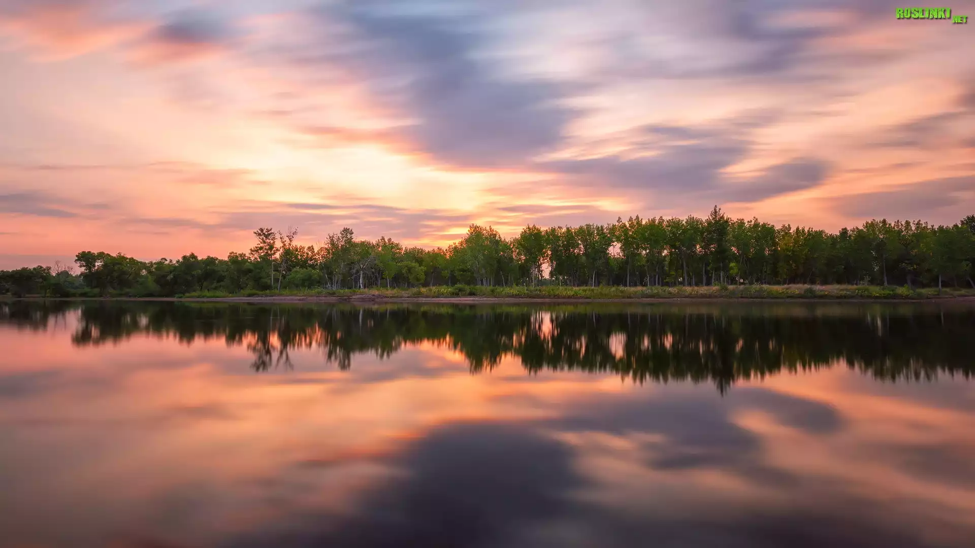 Wschód słońca, Park stanowy, Chatfield State Park, Jezioro, Chatfield Lake, Drzewa, Kolorado, Stany Zjednoczone |