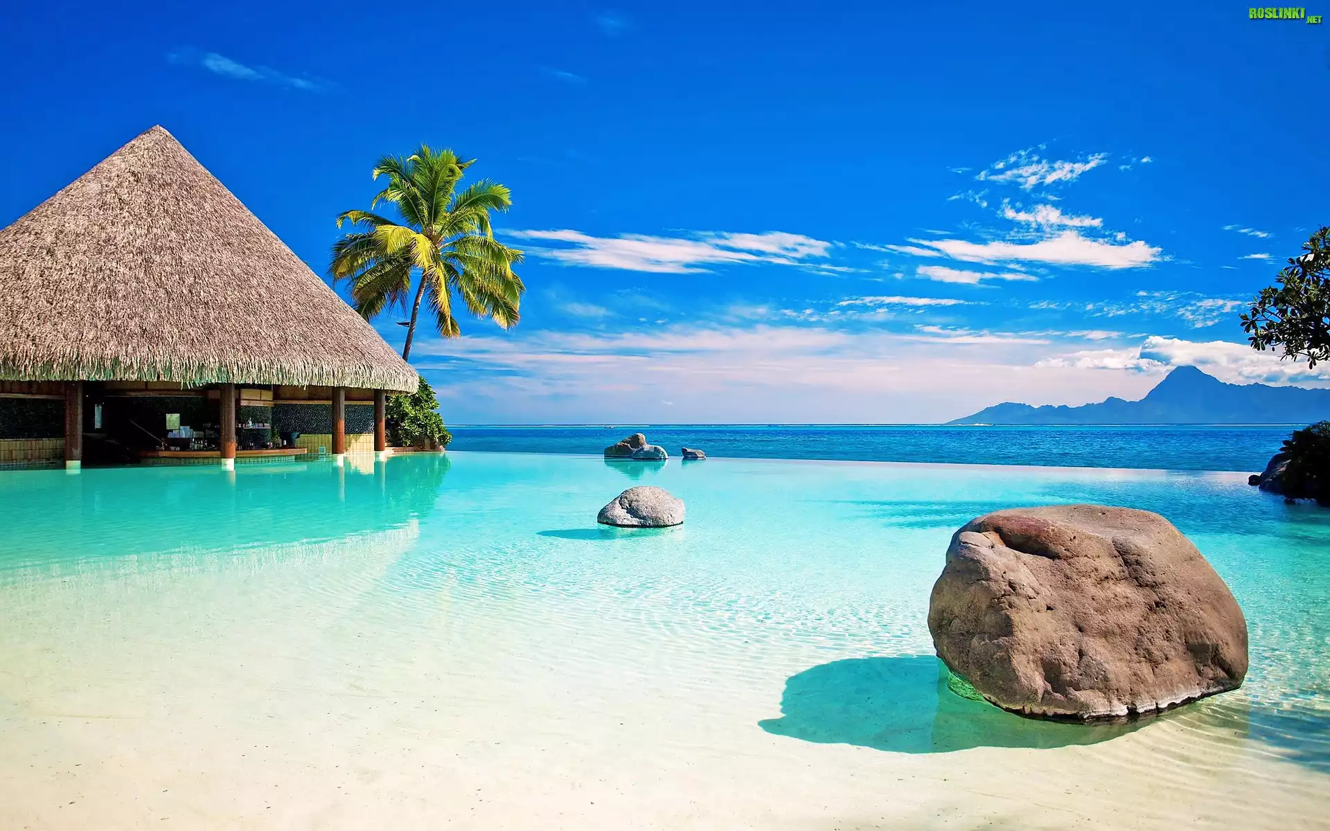 Rośliny: Chatka, Morze, Kamienie, Palma