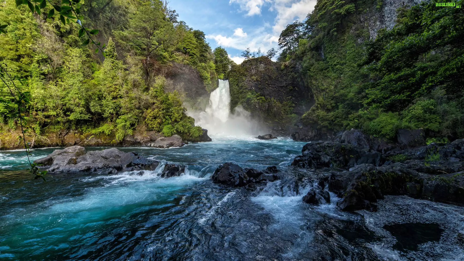 Rośliny: Rzeka, Kamienie, Drzewa, Wodospad Huilo-Huilo Falls, Panguipulli, Chile