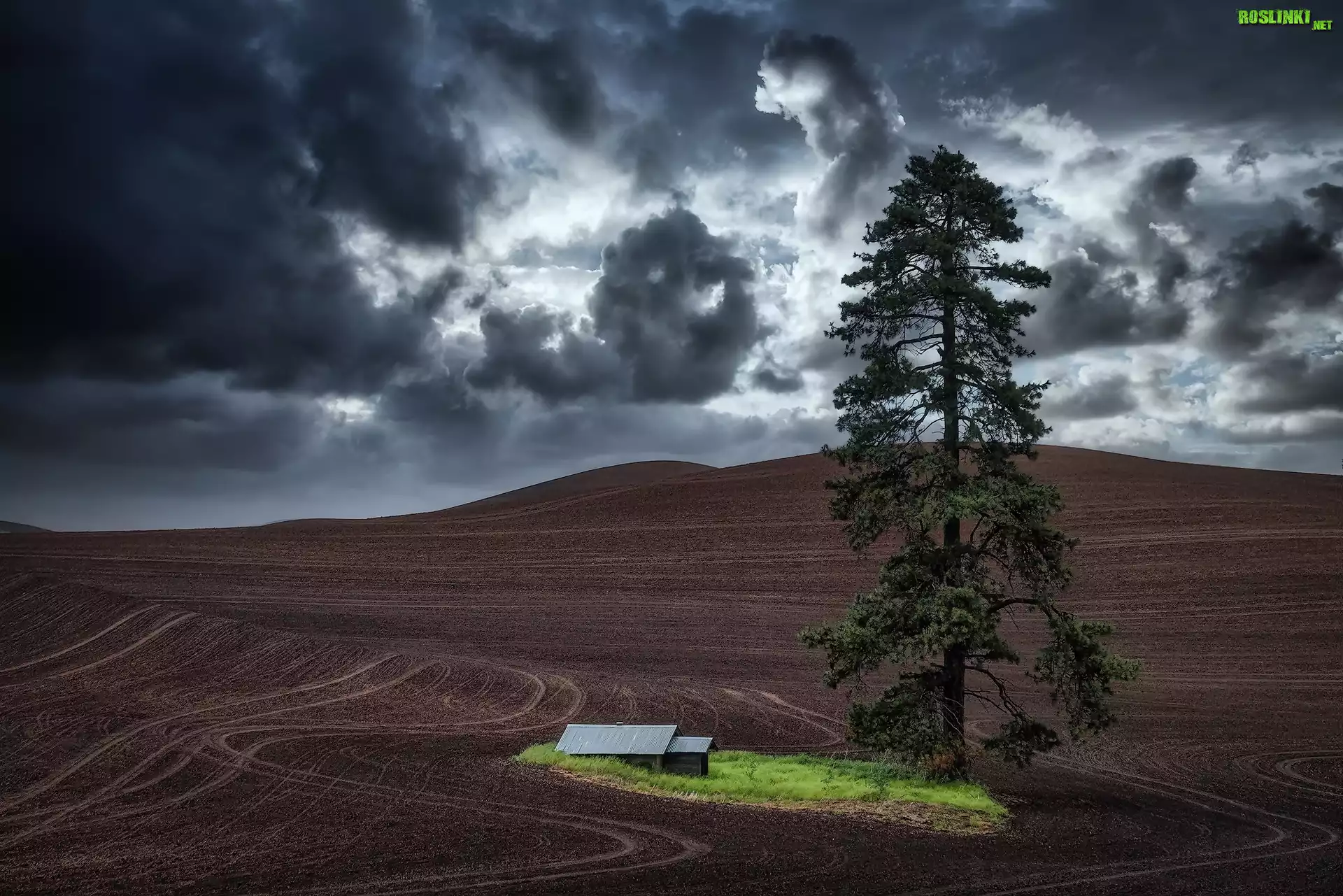 Rośliny: Ciemne, Chmury, Pola, Ślady, Drzewo, Sosna, Budynek