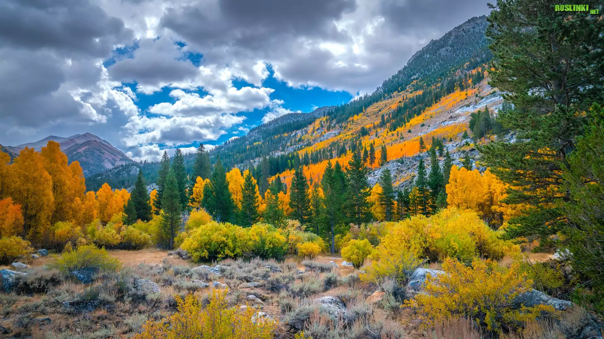 Rośliny: Stany Zjednoczone, Kalifornia, Bishop Creek, Góry, Jesień, Krzewy, Drzewa, Chmury