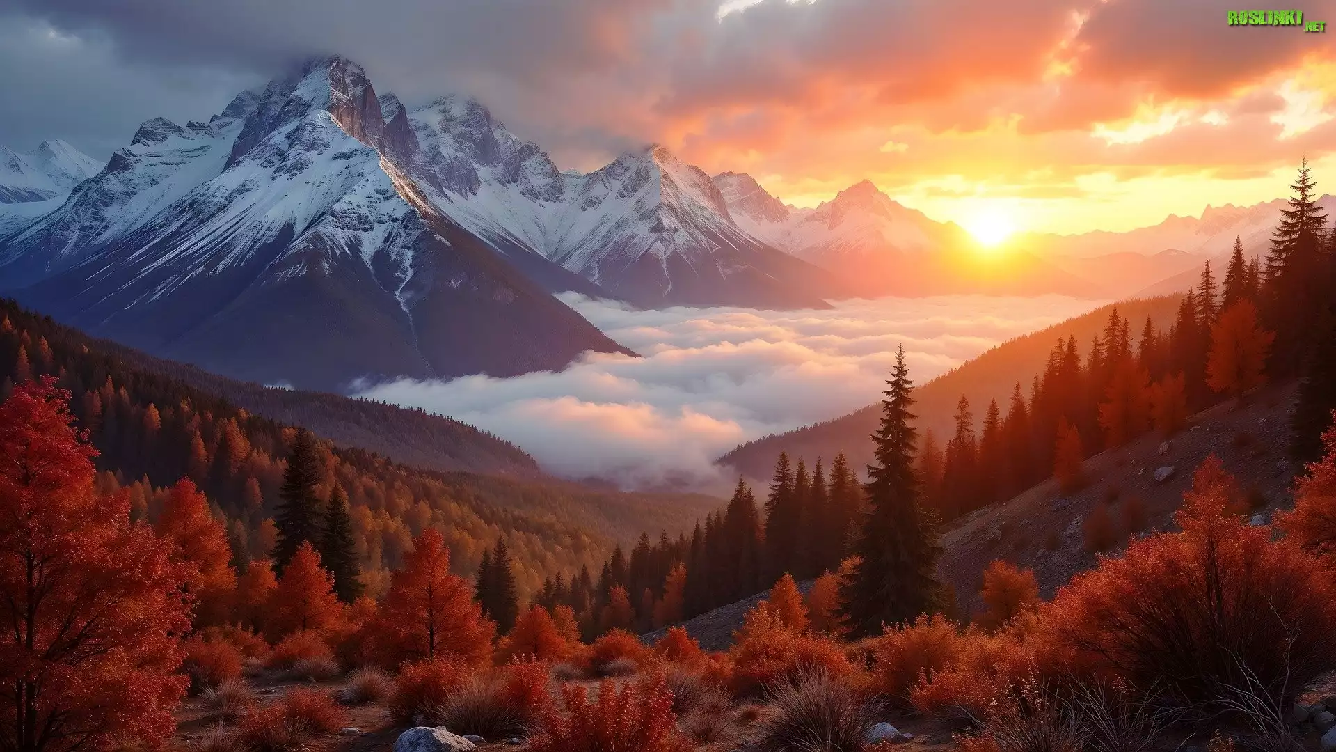 Rośliny: Jesień, Góry, Dolina, Mgła, Drzewa, Las, Niebo, Chmury