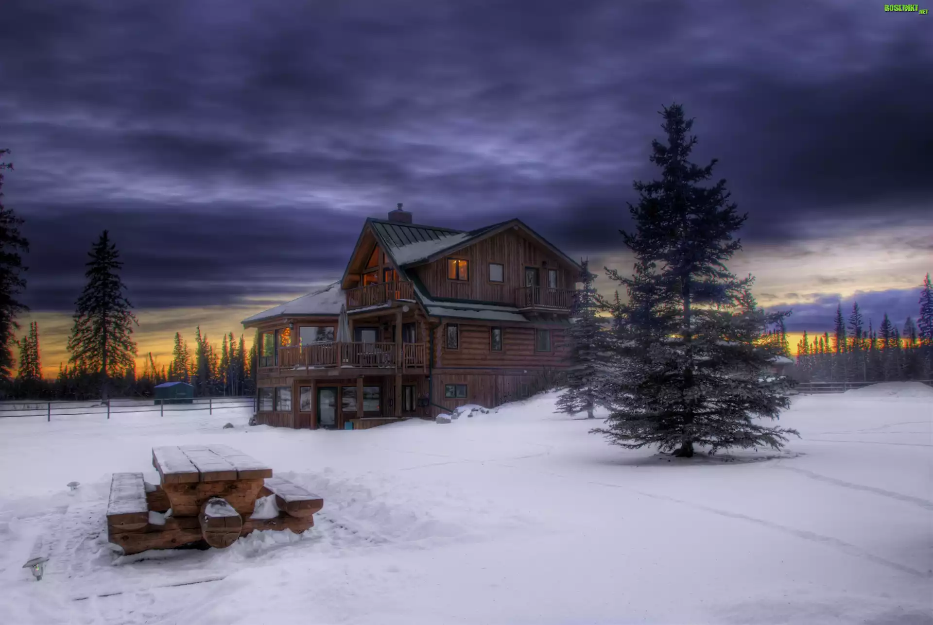Rośliny: Chmury, Śnieg, Ławeczka, Dom, Choinki