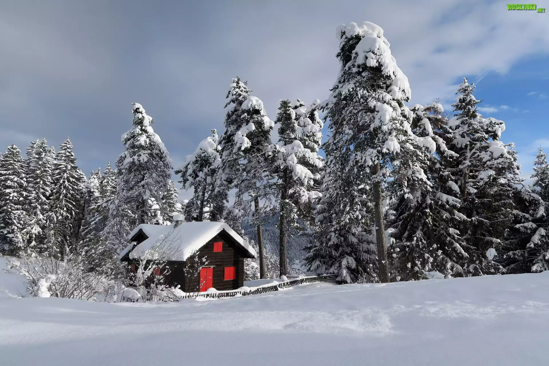 Rośliny: Zima, Las, Dom, Czerwone Drzwi, Okna, Ośnieżone, Drzewa, Chmury