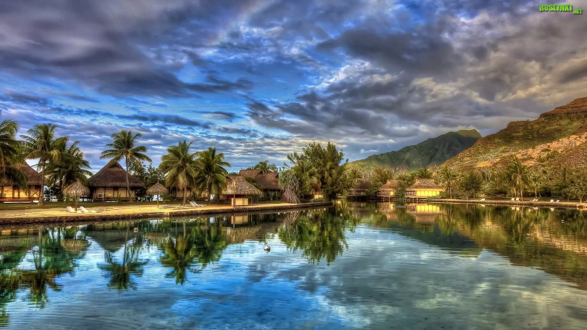 Rośliny: Chmury, Góry, Palmy, Domki, Woda